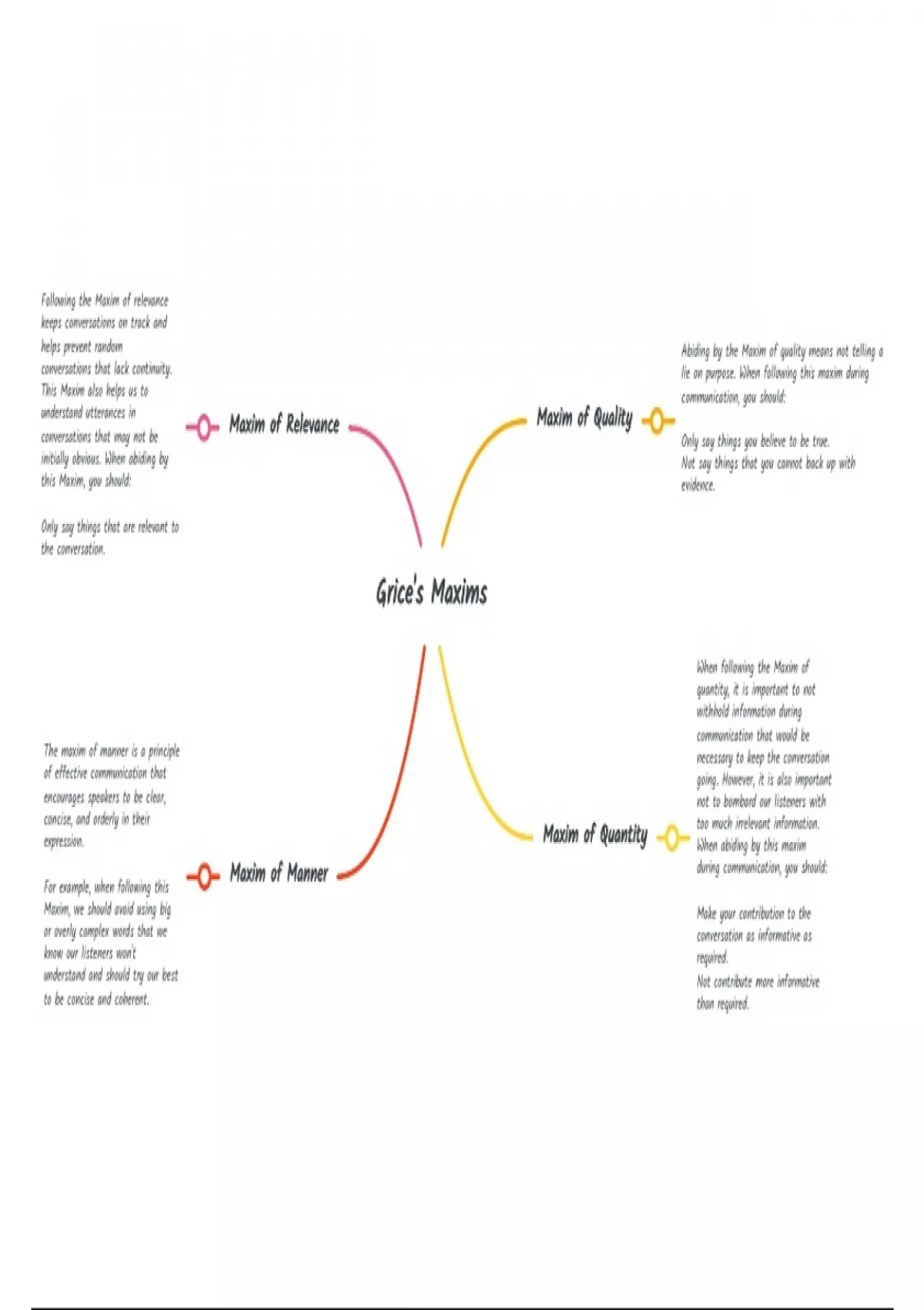 A mind map explaining the four aspects of the theory Grice's Maxims, for AQA English Language.