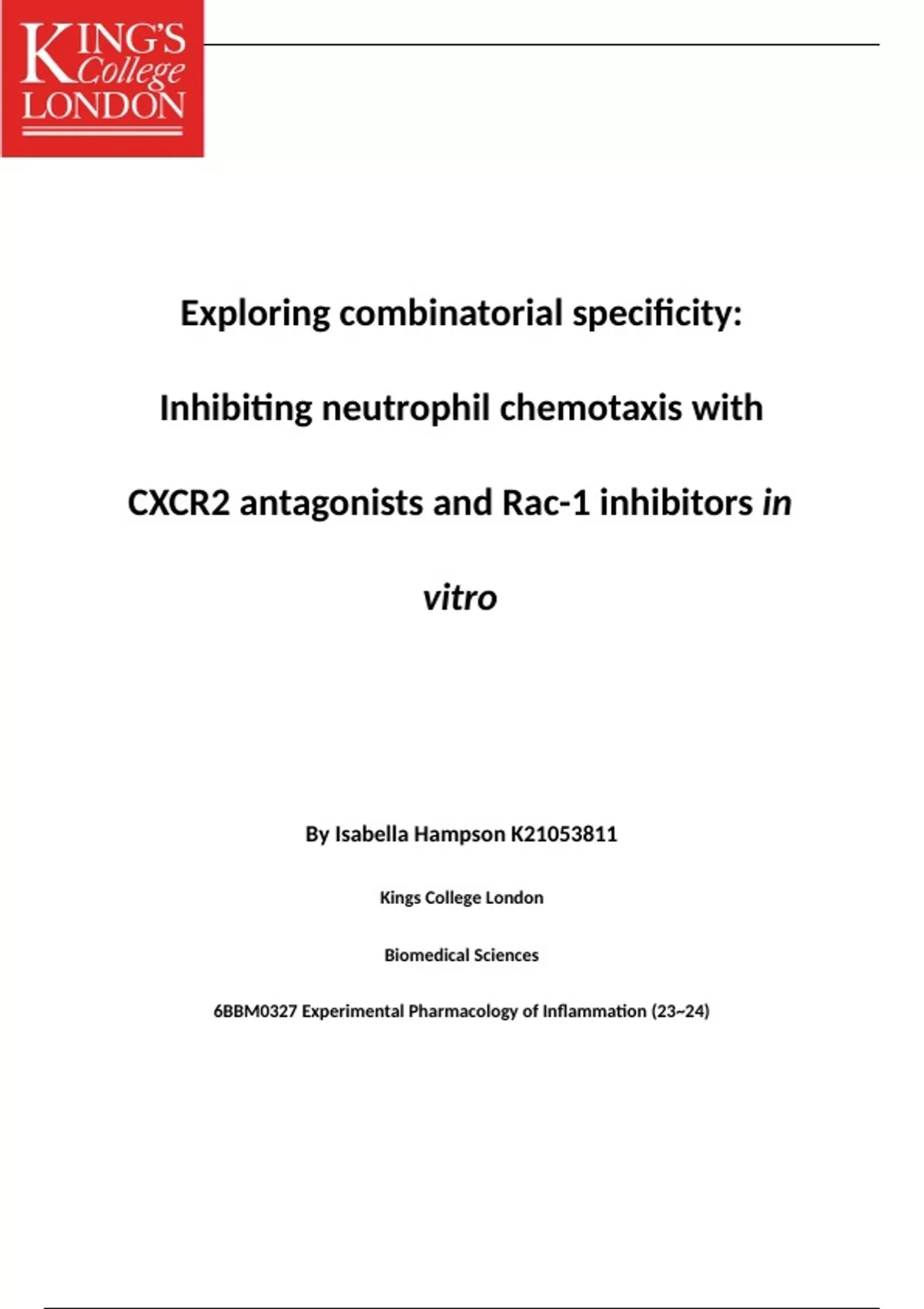 lab write up titles: Exploring combinatorial specificity: Inhibiting neutrophil chemotaxis with CXCR2 antagonists and Rac-1 inhibitors in vitro. Received a first class honours grade (72%) for this essay Includes abstract, aims and objectives, into, methods, results with stats, discussion, conclusion and references.
