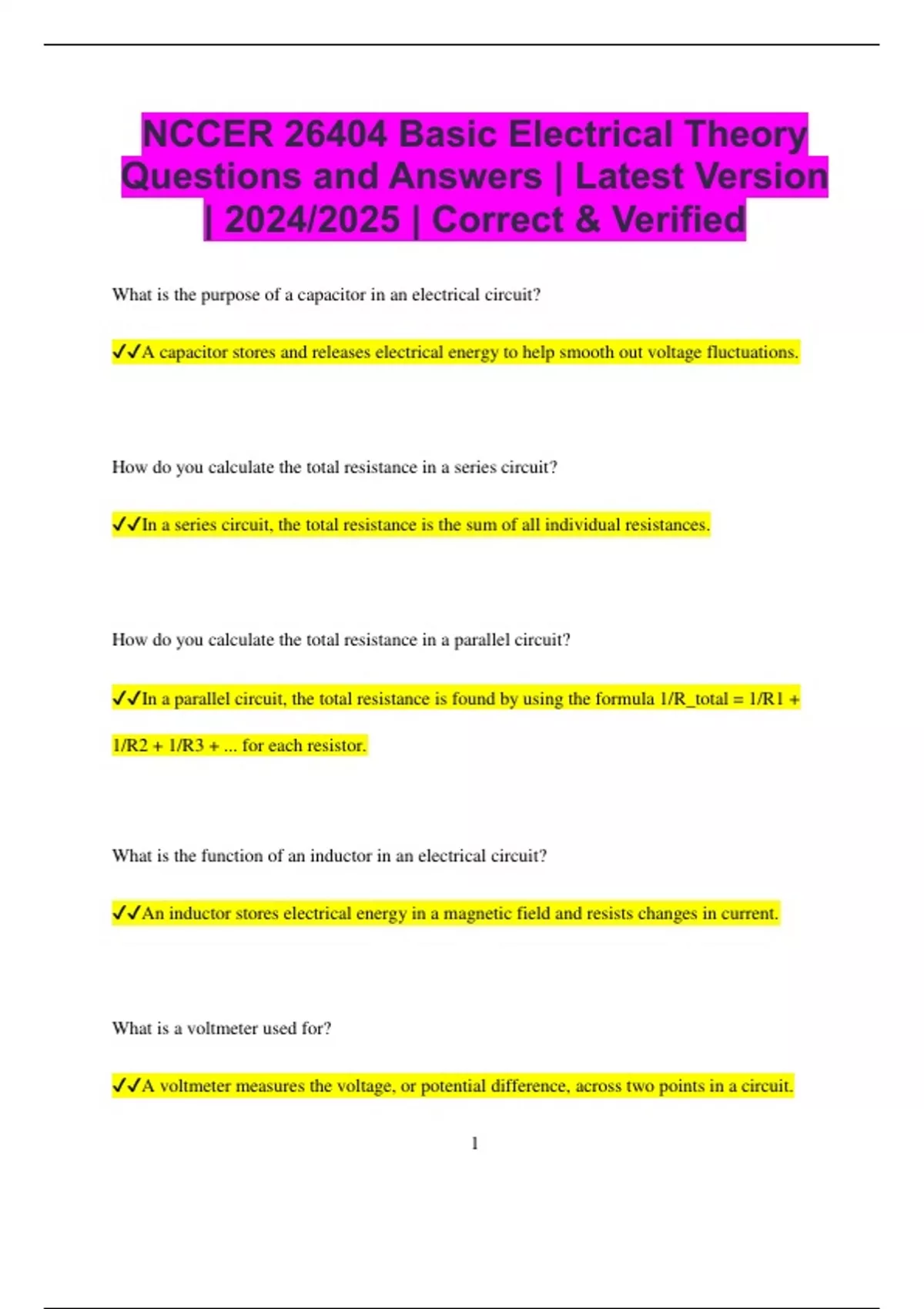 NCCER 26404 Basic Electrical Theory Questions and Answers | Latest Version | 2024/2025 | Correct & Verified What is the purpose of a capacitor in an electrical circuit? A capacitor stores and releases electrical energy to help smooth out voltage fluctuations. How do you calculate the total resistance in a series circuit? In a series circuit, the total resistance is the sum of all individual resistances. How do you calculate the total resistance in a parallel circuit? In a parallel circuit, the total resistance is found by using the formula 1/R_total = 1/R1 + 1/R2 + 1/R3 + ... for each resistor. What is the function of an inductor in an electrical circuit? An inductor stores electrical energy in a magnetic field and resists changes in current. What is a voltmeter used for? A voltmeter measures the voltage, or potential difference, across two points in a circuit. 2 What is the function of a diode in an electrical circuit? A diode allows current to flow in only one direction and blocks it in the opposite direction. What does an ammeter measure? An ammeter measures the current flowing through a circuit. What is the purpose of electrical insulation? Electrical insulation prevents unintended flow of current and protects people from electrical shock. What is Ohm's Law? Ohm's Law states that the current in a circuit is directly proportional to the voltage and inversely proportional to the resistance (I = V/R). What is the unit of electrical resistance? The unit of electrical resistance is the ohm (Ω). 3 What is the formula for calculating electrical power? The formula for calculating electrical power is P = V × I, where P is power, V is voltage, and I is current. What does a circuit breaker do? A circuit breaker automatically interrupts the flow of current to protect the circuit from overloading. What is the difference between alternating current (AC) and direct current (DC)? AC changes direction periodically, while