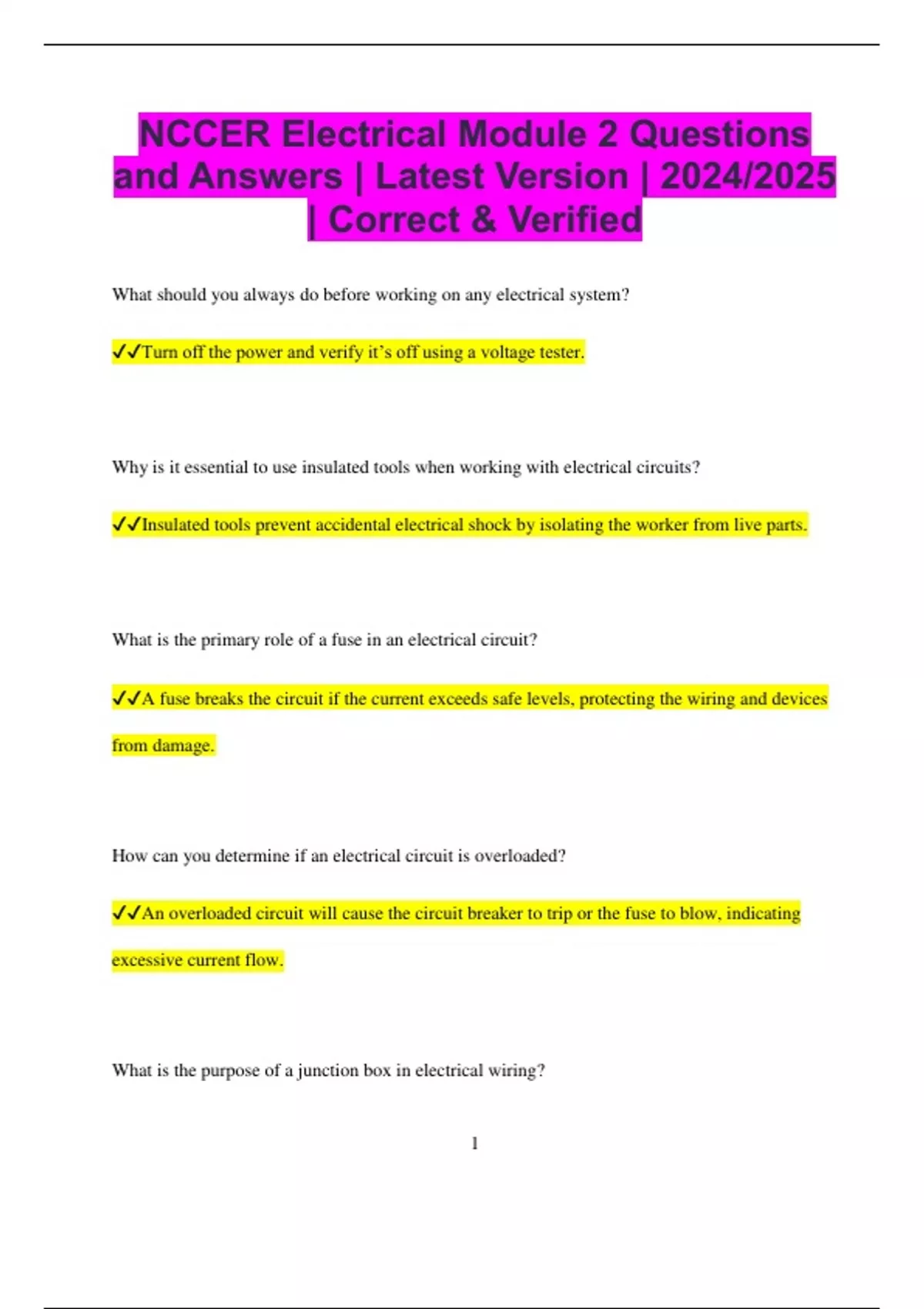 NCCER Electrical Module 2 Questions and Answers | Latest Version | 2024/2025 | Correct & Verified What should you always do before working on any electrical system? Turn off the power and verify it’s off using a voltage tester. Why is it essential to use insulated tools when working with electrical circuits? Insulated tools prevent accidental electrical shock by isolating the worker from live parts. What is the primary role of a fuse in an electrical circuit? A fuse breaks the circuit if the current exceeds safe levels, protecting the wiring and devices from damage. How can you determine if an electrical circuit is overloaded? An overloaded circuit will cause the circuit breaker to trip or the fuse to blow, indicating excessive current flow. What is the purpose of a junction box in electrical wiring? 2 A junction box protects electrical connections and prevents fire hazards by containing any potential sparks or heat. Why should you avoid using extension cords as a permanent wiring solution? Extension cords are designed for temporary use; using them permanently can cause overheating and increased risk of fires. What is the danger of using faulty or damaged electrical equipment? Faulty or damaged equipment can cause electrical shock, fire hazards, or electrocution if not properly repaired. What is the recommended way to store electrical cords when not in use? Coil electrical cords loosely and store them in a dry, safe location to prevent damage and avoid tripping hazards. How do you test for ground faults? Use a ground fault circuit interrupter (GFCI) tester or a multimeter to check if the grounding system is functioning correctly. 3 What is the function of an RCD (Residual Current Device)? An RCD detects and disconnects the power supply when there is a leakage of current, preventing electric shock. Why is it unsafe to overload power strips? Overloading power strips can lead to overheating, fires, and damage to connected devices. What should you do if you see sparks coming from an electrical outlet? Immediately disconnect the power, unplug devices, and call an electrician to inspect the outlet for faults. Why should you never mix water and electricity? Water is a conductor, and mixing it with electricity increases the risk of electrical shock and can be deadly. What is the purpose of arc fault circuit interrupters (AFCIs)? AFCIs detect and stop arc faults in wiring, preventing potential electrical fires caused by sparking. 4 Why is it important to have proper lighting when working on electrical systems? Adequate lighting ensures you can clearly see wiring and components, reducing the risk of errors and accidents. How do you calculate the total current of a parallel circuit? In a parallel circuit, the total current is the sum of the currents through each parallel branch. What should you do if you encounter a damaged electrical wire during installation? Immediately stop work, turn off the power, and replace or repair the damaged wire before proceeding. What is the role of a transformer in an electrical system? A transformer adjusts the voltage levels to ensure safe and efficient power distribution over long distances. What are the risks of working with electricity in damp or wet environments? Wet conditions increase the risk of electrical shock, as water can conduct electricity, causing severe injury or death.