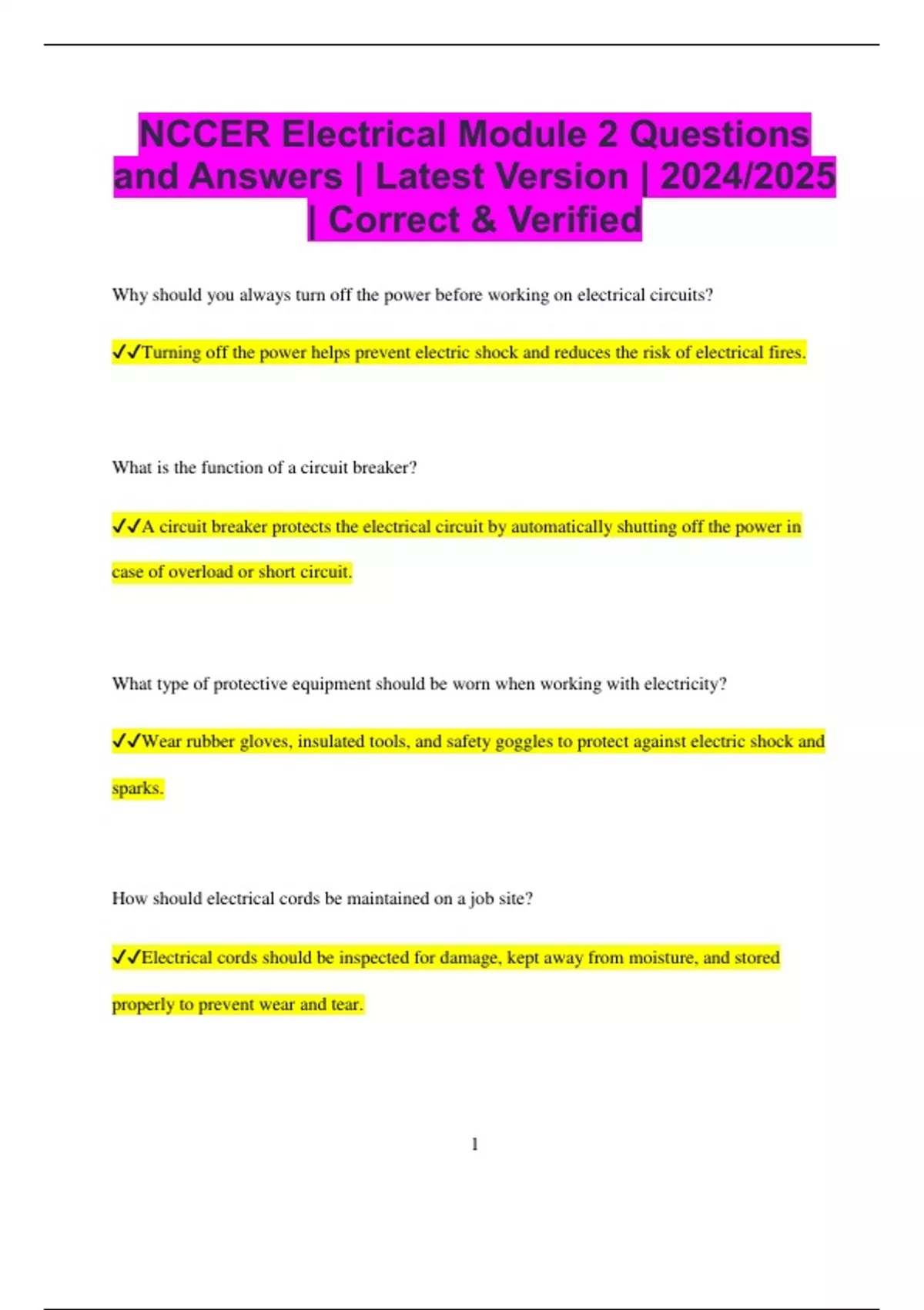 NCCER Electrical Module 2 Questions and Answers | Latest Version | 2024/2025 | Correct & Verified Why should you always turn off the power before working on electrical circuits? Turning off the power helps prevent electric shock and reduces the risk of electrical fires. What is the function of a circuit breaker? A circuit breaker protects the electrical circuit by automatically shutting off the power in case of overload or short circuit. What type of protective equipment should be worn when working with electricity? Wear rubber gloves, insulated tools, and safety goggles to protect against electric shock and sparks. How should electrical cords be maintained on a job site? Electrical cords should be inspected for damage, kept away from moisture, and stored properly to prevent wear and tear. 2 What does the term "conductor" refer to in electrical systems? A conductor is a material that allows the flow of electric current, typically a wire made of copper or aluminum. What is the purpose of a fuse in an electrical circuit? A fuse protects the circuit by breaking the connection when the current exceeds a safe level, preventing damage or fire. Why is it important to use the correct wire size for electrical circuits? Using the correct wire size ensures the wire can safely carry the electrical load without overheating or causing a fire. What is the difference between AC and DC electricity? AC (alternating current) changes direction periodically, while DC (direct current) flows in one direction only. What should you do if you find an exposed electrical wire on the job site? Report it immediately, and avoid touching it. Ensure it is properly insulated or de-energized before working near it. 3 What is the function of a grounding rod in an electrical system? A grounding rod connects the electrical system to the earth, ensuring that electricity flows safely in case of a fault. What is the purpose of an electrical panel? An electrical panel distributes electrical power to various circuits and houses circuit breakers or fuses to protect the system. What are the risks associated with working near energized electrical equipment? The risks include electric shock, burns, and potential fires. Always ensure equipment is de- energized before working on it. Why should electrical equipment be kept dry? Water or moisture can cause short circuits, corrosion, and increase the risk of electrical shock. What is the first step before performing electrical work on a circuit? Always turn off the power and verify that the circuit is de-energized using a voltage tester. 4 What does a GFCI (Ground Fault Circuit Interrupter) do? A GFCI detects differences between the hot and neutral wires, quickly shutting off the power to prevent electric shock. What are some common electrical hazards on construction
