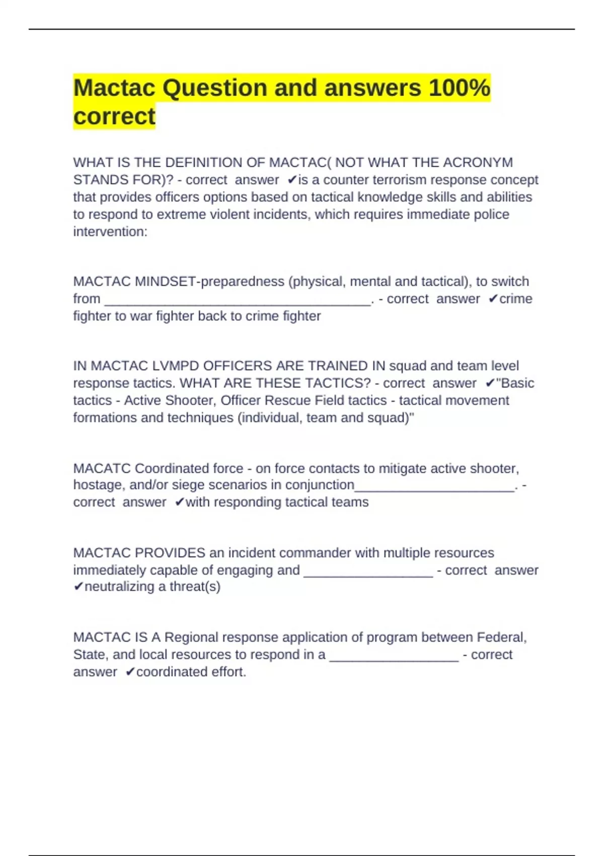 correct answer ✔MACTAC - Multi Assault, Counter Terrorism Action