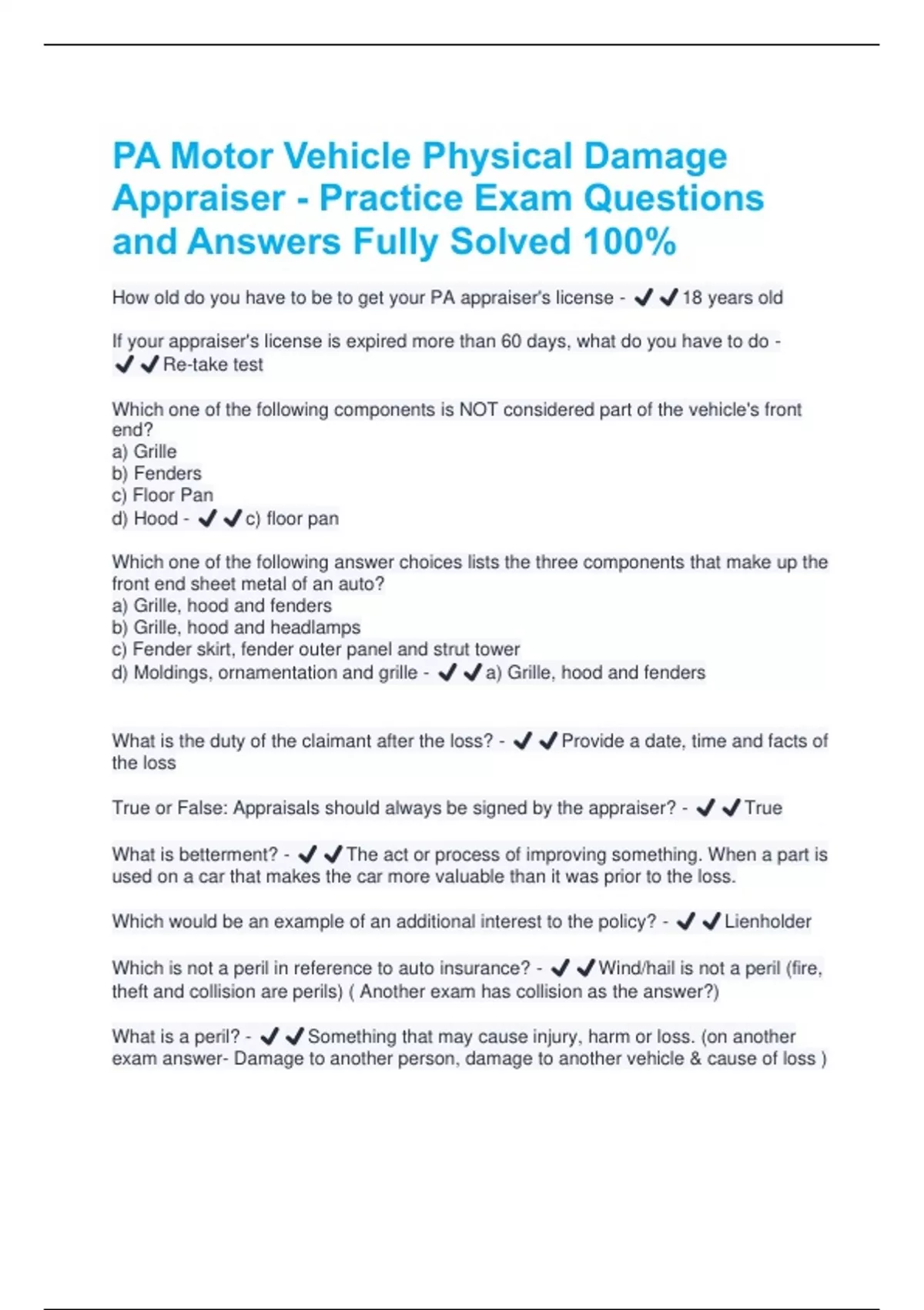 How old do you have to be to get your PA appraiser's license - ️️18 years old If your appraiser's license is expired more than 60 days, what do you have to do - ️️Re-take test Which one of the following components is NOT considered part of the vehicle's front end? a) Grille b) Fenders c) Floor Pan d) Hood - ️️c) floor pan Which one of the following answer choices lists the three components that make up the front end sheet metal of an auto? a) Grille, hood and fenders b) Grille, hood and headlamps c) Fender skirt, fender outer panel and strut tower d) Moldings, ornamentation and grille - ️️a) Grille, hood and fenders