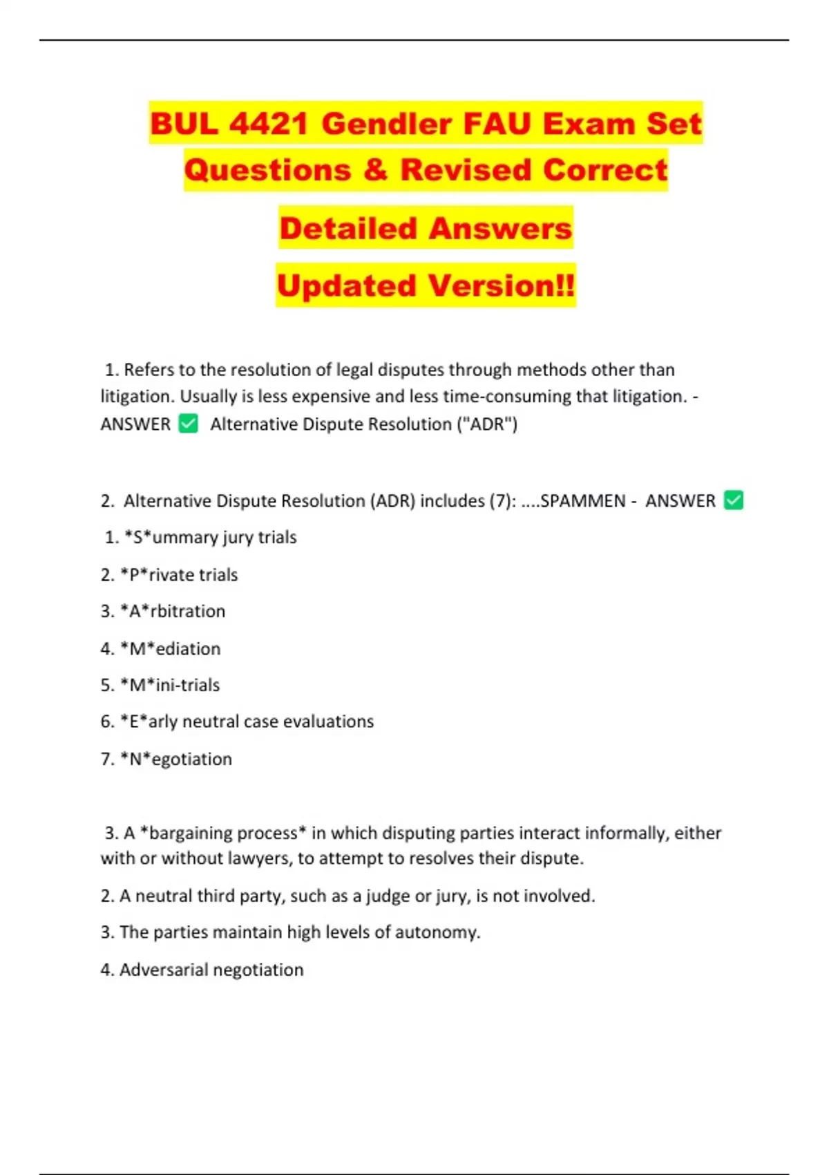BUL 4421 Gendler FAU Exam Set Questions & Revised Correct Detailed Answers Updated Version!! 1. Refers to the resolution of legal disputes through methods other than litigation. Usually is less expensive and less time-consuming that litigation. - ANSWER Alternative Dispute Resolution ("ADR") 2. Alternative Dispute Resolution (ADR) includes (7): ....SPAMMEN - ANSWER 1. *S*ummary jury trials 2. *P*rivate trials 3. *A*rbitration 4. *M*ediation 5. *M*ini-trials 6. *E*arly neutral case evaluations 7. *N*egotiation 3. A *bargaining process* in which disputing parties interact informally, either with or without lawyers, to attempt to resolves their dispute. 2. A neutral third party, such as a judge or jury, is not involved. 3. The parties maintain high levels of autonomy. 4. Adversarial negotiation 5. Problem-solving - ANSWER Negotiation 4. A negotiation in which each party seeks to *maximize its own gain.* - ANSWER Adversarial negotiation 5. A negotiation in which the parties seek to *achieve joint gain.* - ANSWER Problem-solving 6. The disputing parties select a neutral party to help facilitate communication and suggest ways for the parties to solve their dispute. - ANSWER Mediation 7. 1. Alternative dispute resolution by neutral third party outside of judicial setting. 2. Voluntary process in that parties typically have a *contractual agreement to resolve* disputes (only for civil, not criminal). - ANSWER Arbitration 8. Arbitration agreement may stipulate (2): - ANSWER *selected* 2. How arbitration is *administered* 9. 1. Similar to a trial 2. Both parties present their case to a neutral third-party 1. How arbitrator is 3. Parties may represent themselves or use legal counsel - ANSWER Arbitration Hearing 10. 1. Arbitrator typically provides a decision within 30 days of the arbitration hearing. 2. Arbitrator's decision is called an award, even if no monetary compensation is awarded. - ANSWER Arbitrator's Award 11. 1. More efficient & less expensive than litigation. 2. Parties have more control over the process. 3. Parties can choose arbitrator with expertise in field concerning dispute. 4. Arbitrator has greater flexibility in decision than judge. - ANSWER Arbitration Advantages