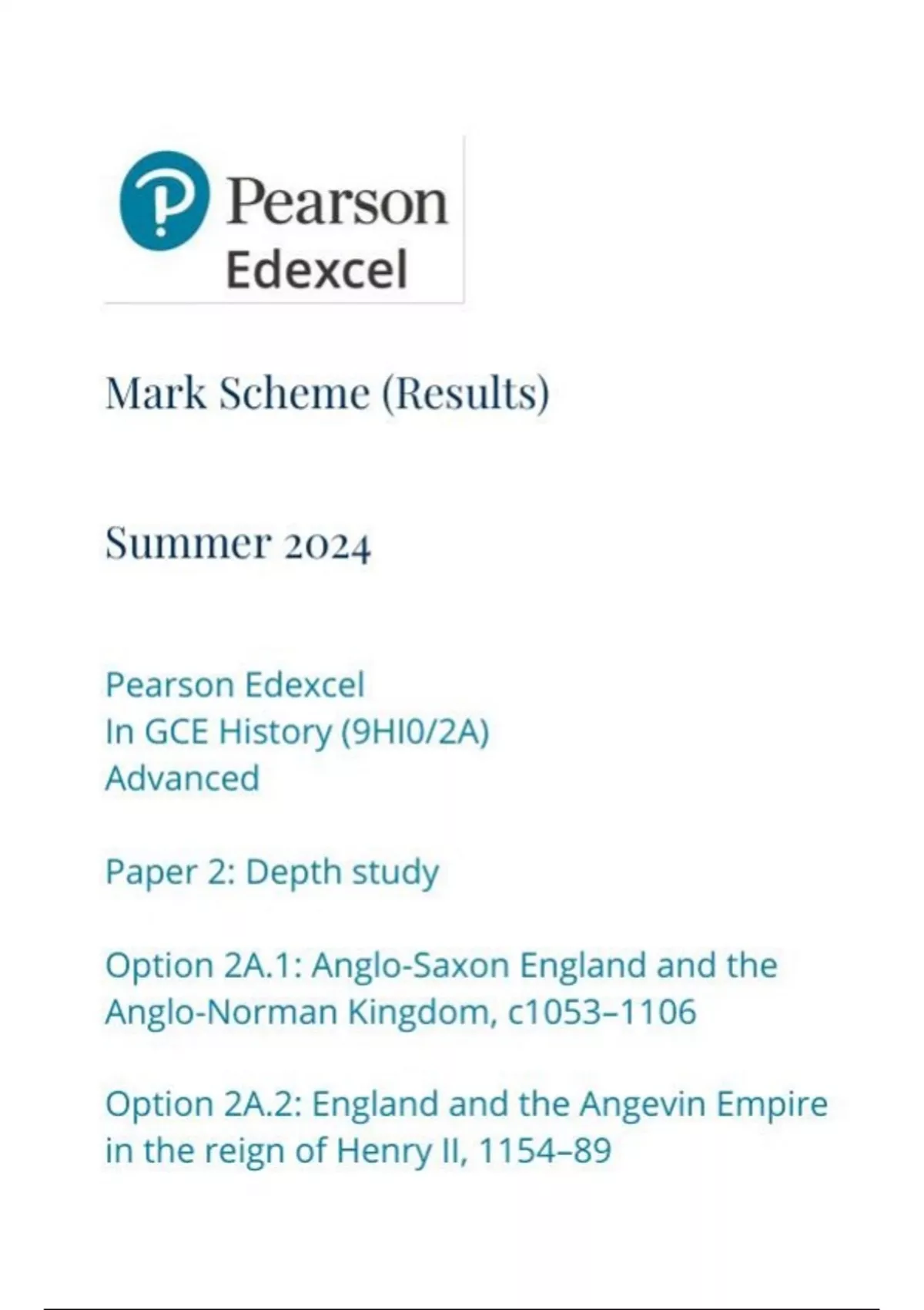 Pearson Edexcel In GCE History (9HI0/2A) Advanced Paper 2: Depth study Option 2A.1: Anglo-Saxon England and the Anglo-Norman Kingdom, c1053–1106 Option 2A.2: England and the Angevin Empire in the reign of Henry II, 1154–89 mark scheme june 2024