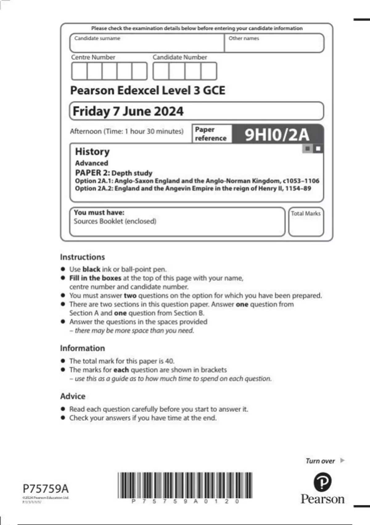 Pearson Edexcel Level 3 GCE History Advanced PAPER 2: Depth study Option 2A.1: Anglo-Saxon England and the Anglo-Norman Kingdom, c1053–1106 Option 2A.2: England and the Angevin Empire in the reign of Henry II, 1154–89 question paper june 2024 9hi0-2a