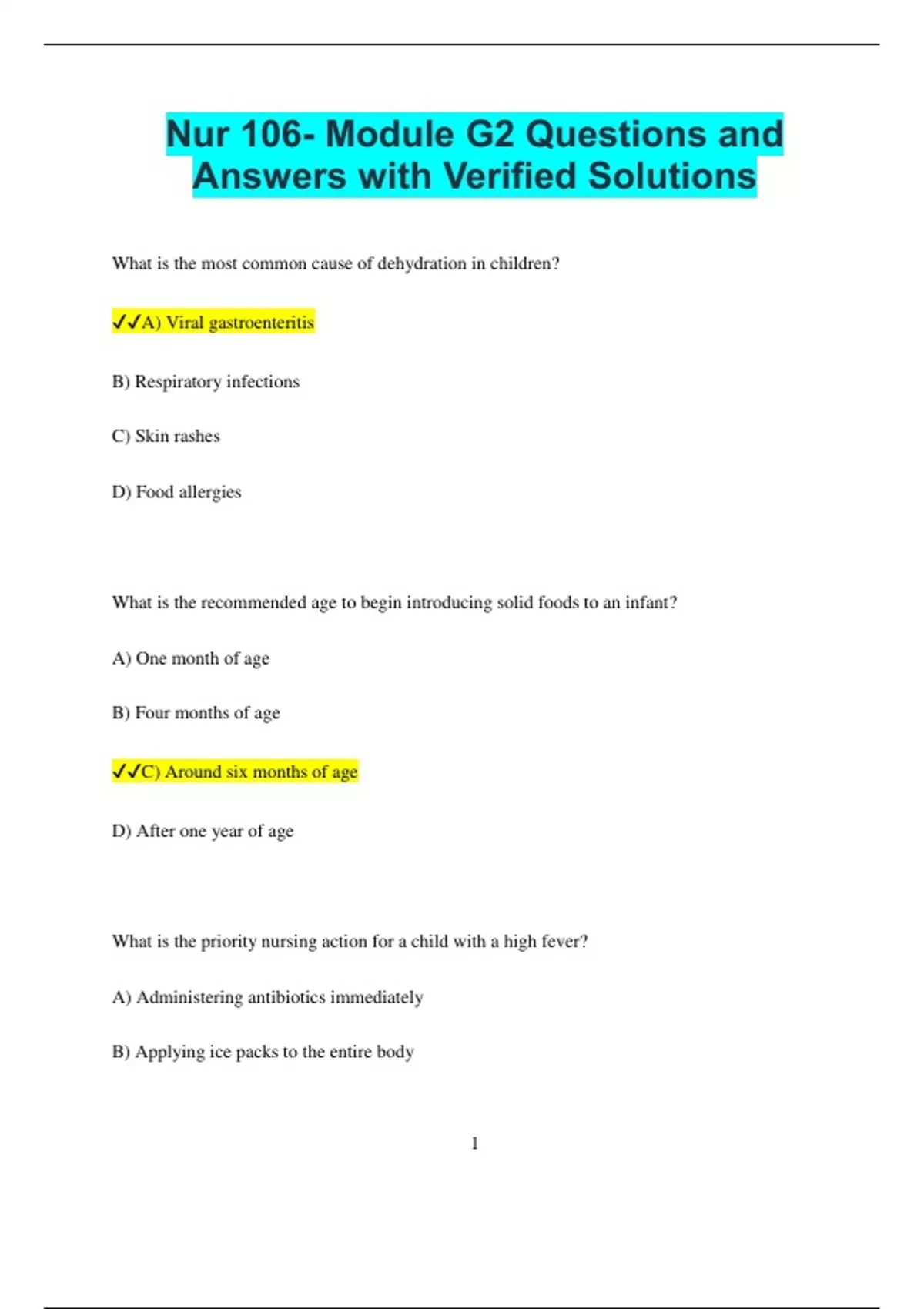Nur 106- Module G2 Questions and Answers with Verified Solutions What is the most common cause of dehydration in children? A) Viral gastroenteritis B) Respiratory infections C) Skin rashes D) Food allergies What is the recommended age to begin introducing solid foods to an infant? A) One month of age B) Four months of age C) Around six months of age D) After one year of age What is the priority nursing action for a child with a high fever? A) Administering antibiotics immediately B) Applying ice packs to the entire body 2 C) Providing fluids to prevent dehydration D) Restricting activity until the fever resolves What is a common developmental milestone for a 12-month-old child? A) Walking with support or independently B) Writing simple words C) Speaking in complete sentences D) Tying their shoes What is the primary reason for conducting a head-to-toe assessment on a pediatric patient? B) To identify genetic conditions C) To prepare for advanced medical procedures A) To gather baseline data and identify any abnormalities D) To document weight only Which toy is most appropriate for a 3-year-old child? A) A complex jigsaw puzzle B) Building blocks 3 C) A chemistry set D) A smartphone What is a common sign of respiratory distress in an infant? A) Nasal flaring B) Laughing during feedings C) Excessive sleeping D) Frequent hiccups What is the priority action when a child is experiencing an allergic reaction? B) Give antihistamines if prescribed A) Assess and maintain airway patency C) Encourage fluid intake D) Monitor for changes in skin color What is the purpose of a well-child visit? A) To monitor growth and development B) To treat acute illnesses 4 C) To diagnose chronic conditions D) To administer emergency medications When educating parents about child safety, what is the best way to prevent poisoning in toddlers? A) Place cleaning supplies in an unlocked cabinet B) Store hazardous materials out of reach and in locked