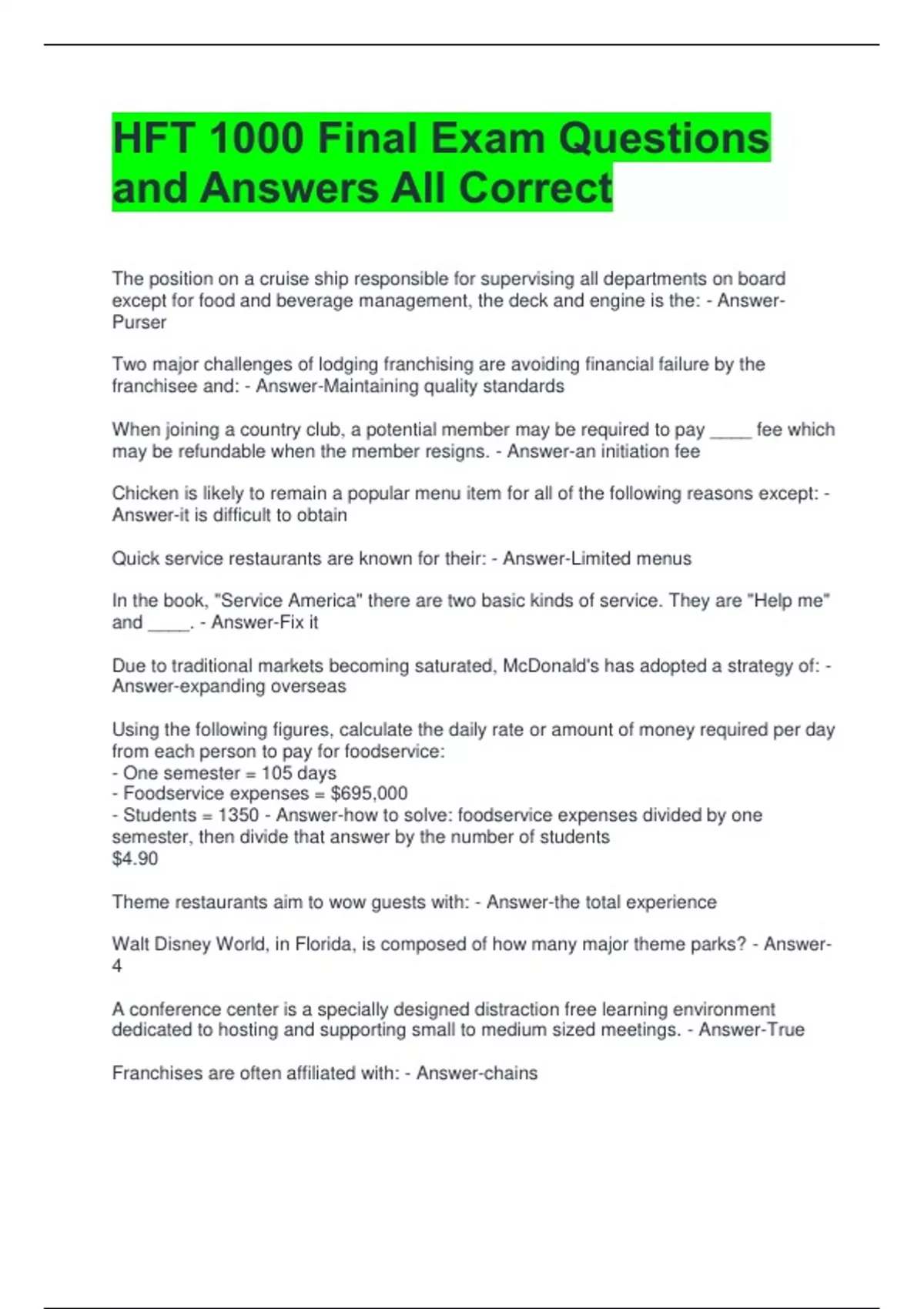 HFT 1000 Final Exam Questions and Answers All Correct The position on a cruise ship responsible for supervising all departments on board except for food and beverage management, the deck and engine is the: - Answer-Purser Two major challenges of lodging franchising are avoiding financial failure by the franchisee and: - Answer-Maintaining quality standards When joining a country club, a potential member may be required to pay ____ fee which may be refundable when the member resigns. - Answer-an initiation fee Chicken is likely to remain a popular menu item for all of the following reasons except: - Answer-it is difficult to obtain Quick service restaurants are known for their: - Answer-Limited menus In the book, "Service America" there are two basic kinds of service. They are "Help me" and ____. - Answer-Fix it Due to traditional markets becoming saturated, McDonald's has adopted a strategy of: - Answer-expanding overseas Using the following figures, calculate the daily rate or amount of money required per day from each person to pay for foodservice: - One semester = 105 days - Foodservice expenses = $695,000 - Students = 1350 - Answer-how to solve: foodservice expenses divided by one semester, then divide that answer by the number of students $4.90