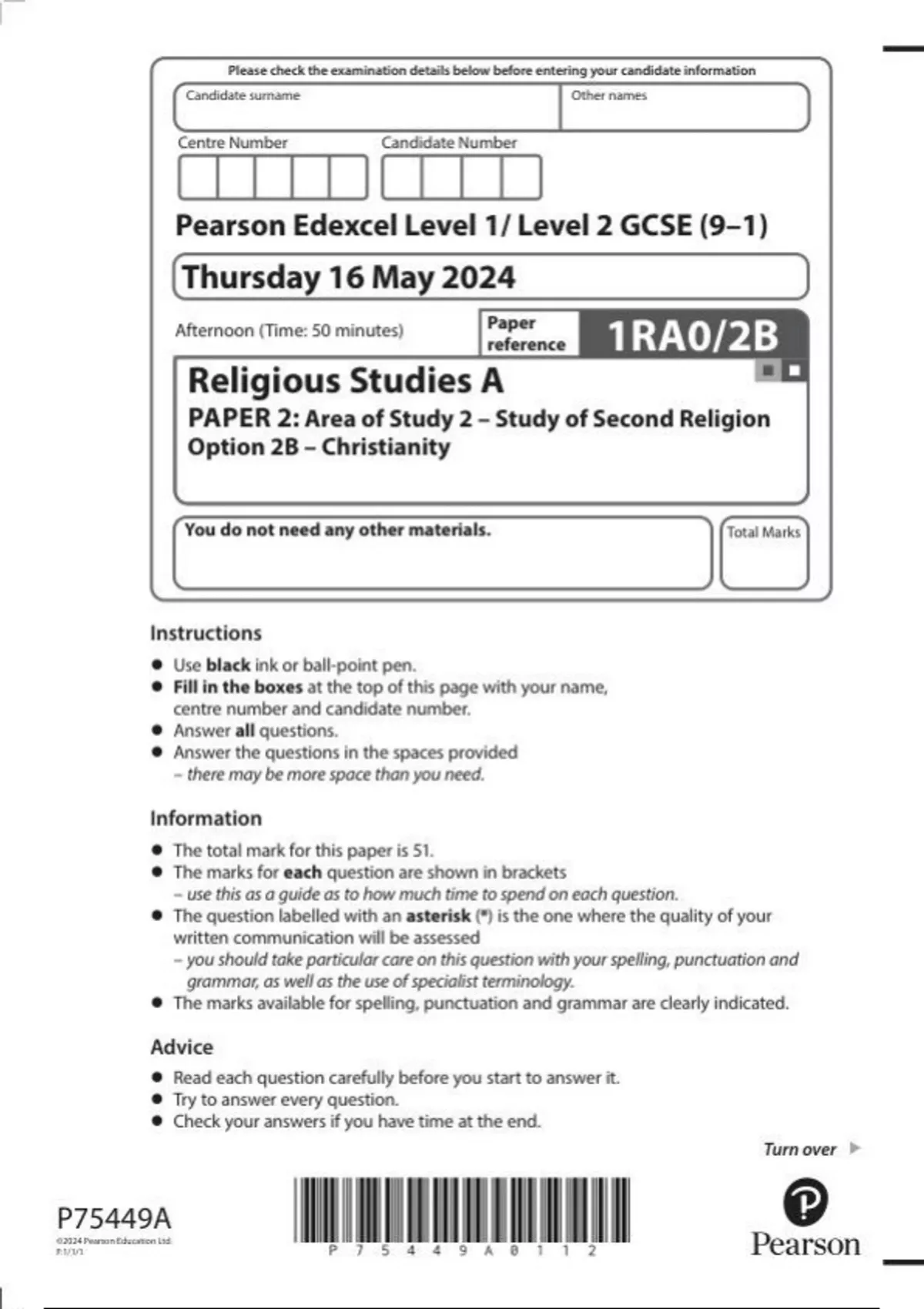 Pearson Edexcel Level 1/ Level 2 GCSE (9–1) Religious Studies A PAPER 2: Area of Study 2 – Study of Second Religion Option 2B – Christianity question paper june 2024 1ra0-2b