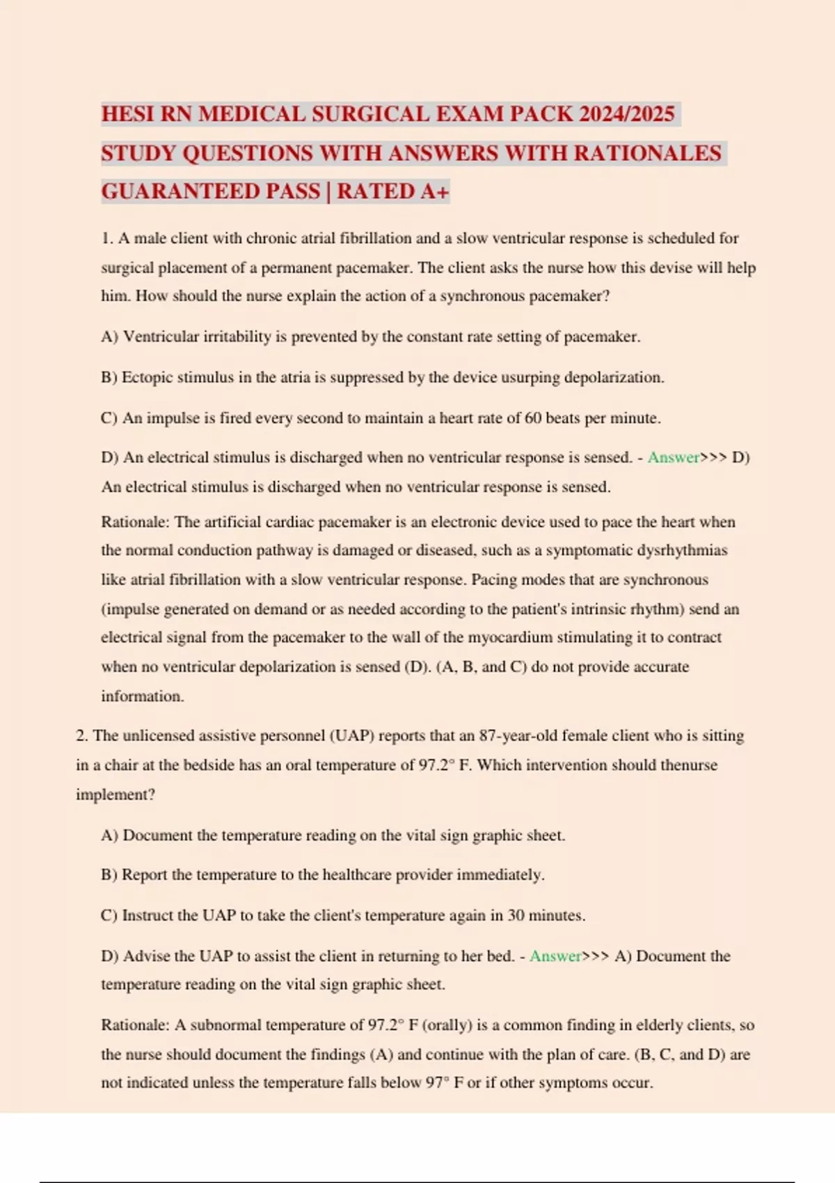 HESI RN MEDICAL SURGICAL EXAM PACK 2024/2025 STUDY QUESTIONS WITH ANSWERS WITH RATIONALES GUARANTEED PASS | RATED A+ 1. A male client with chronic atrial fibrillation and a slow ventricular response is scheduled for surgical placement of a permanent pacemaker. The client asks the nurse how this devise will help him. How should the nurse explain the action of a synchronous pacemaker? A) Ventricular irritability is prevented by the constant rate setting of pacemaker. B) Ectopic stimulus in the atria is suppressed by the device usurping depolarization. C) An impulse is fired every second to maintain a heart rate of 60 beats per minute. D) An electrical stimulus is discharged when no ventricular response is sensed. - Answer>>> D) An electrical stimulus is discharged when no ventricular response is sensed. Rationale: The artificial cardiac pacemaker is an electronic device used to pace the heart when the normal conduction pathway is damaged or diseased, such as a symptomatic dysrhythmias like atrial fibrillation with a slow ventricular response. Pacing modes that are synchronous (impulse generated on demand or as needed according to the patient's intrinsic rhythm) send an electrical signal from the pacemaker to the wall of the myocardium stimulating it to contract when no ventricular depolarization is sensed (D). (A, B, and C) do not provide accurate information. 2. The unlicensed assistive personnel (UAP) reports that an 87-year-old female client who is sitting in a chair at the bedside has an oral temperature of 97.2° F. Which intervention should the nurse implement? A) Document the temperature reading on the vital sign graphic sheet. B) Report the temperature to the healthcare provider immediately. C) Instruct the UAP to take the client's temperature again in 30 minutes. D) Advise the UAP to assist the client in returning to her bed. - Answer>>> A) Document the temperature reading on the vital sign graphic sheet. Rationale: A subnormal temperature of 97.2° F (orally) is a common finding in elderly clients, so the nurse should document the findings (A) and continue with the plan of care. (B, C, and D) are not indicated unless the temperature falls below 97° F or if other symptoms occur. 3. The nurse is completing the health assessment of a 79-year-old male client who denies any significant health problems. Which finding requires the most immediate follow-up assessment? A) Kyphosis with a reduction in height. B) Dilated superficial veins on both legs. C) External hemorrhoids with itching. D) Yellowish discoloration of the sclerae. - Answer>>> D) Yellowish discoloration of the sclerae. Rationale: Jaundice, a yellowish discoloration of the sclerae (D), may indicate liver damage and requires further assessment. Kyphosis and height reduction (A) due to bone loss, varicose veins (B), and external hemorrhoids with itching (C) are common findings in the elderly that do not require immediate intervention. 4. Which finding should the nurse report to the healthcare provider for a client with a circumferential extremity burn? A) Full thickness burns rather than partial thickness. B) Supinates extremity but unable to fully pronate the extremity. C) Slow capillary refill in the digits with absent distal pulse points. D) Inability to distinguish sharp versus dull sensations in the extremity. - Answer>>> C) Slow capillary refill in the digits with absent distal pulse points