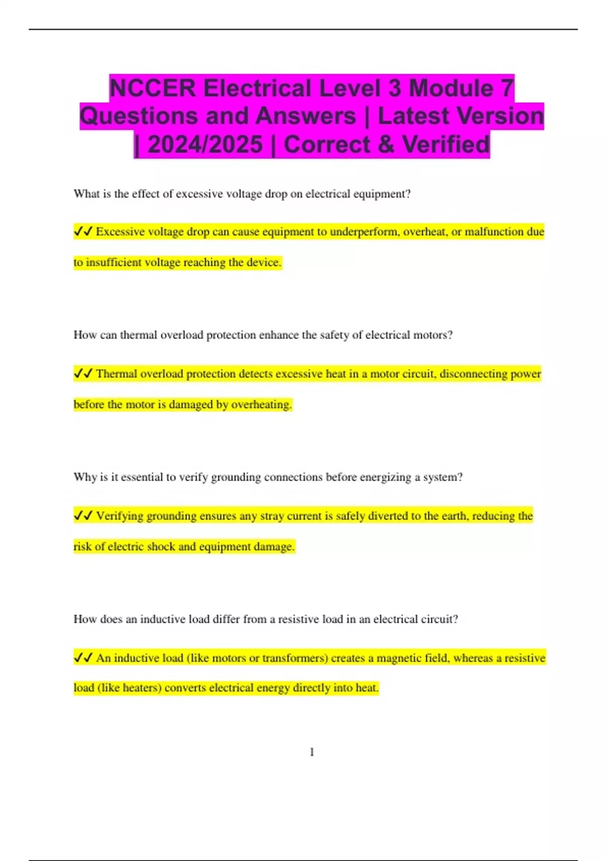 NCCER Electrical Level 3 Module 7 Questions and Answers | Latest Version | 2024/2025 | Correct & Verified What is the effect of excessive voltage drop on electrical equipment? Excessive voltage drop can cause equipment to underperform, overheat, or malfunction due to insufficient voltage reaching the device. How can thermal overload protection enhance the safety of electrical motors? Thermal overload protection detects excessive heat in a motor circuit, disconnecting power before the motor is damaged by overheating. Why is it essential to verify grounding connections before energizing a system? Verifying grounding ensures any stray current is safely diverted to the earth, reducing the risk of electric shock and equipment damage. How does an inductive load differ from a resistive load in an electrical circuit? An inductive load (like motors or transformers) creates a magnetic field, whereas a resistive load (like heaters) converts electrical energy directly into heat. 2 What safety considerations should be made when working on electrical circuits with live voltage? Always use insulated tools, wear rubber gloves, and ensure proper lockout/tagout procedures are in place to prevent accidental shocks. How do you determine the maximum safe current for a wire in an electrical installation? The maximum safe current is determined by the wire's gauge, insulation type, and the ambient temperature around the wire. What could happen if a conductor is undersized for its intended load? An undersized conductor can overheat, potentially causing insulation damage, circuit failure, or even a fire. What is the role of a motor starter in controlling an electric motor? A motor starter protects and controls the motor by limiting starting current and providing protection against overloads. Why is it crucial to follow correct color coding when wiring circuits? 3 Correct color coding ensures safety, prevents confusion, and helps easily identify live, neutral, and ground wires during installation or troubleshooting. What is a harmonic filter, and why might it be used in electrical installations? A harmonic filter reduces unwanted harmonic distortion caused by electronic devices, improving power quality and preventing overheating of equipment. How does an electrical transformer handle voltage conversion? A transformer uses electromagnetic induction to step up or step down voltage levels, ensuring compatibility with different electrical systems. What is the primary advantage of using solid copper conductors in electrical wiring? Solid copper conductors provide excellent conductivity, ensuring reliable performance and reducing energy losses in electrical systems. What factors should be considered when selecting a cable for outdoor installation? Consider factors like UV resistance, moisture protection, temperature range, and mechanical strength to ensure the cable withstands harsh outdoor conditions. 4 How can a short circuit in an electrical system be quickly identified and rectified? Short circuits can be identified by testing for continuity in unexpected areas, using a multimeter, and repairing damaged insulation or faulty connections. Why might an electrical system require the use of a step-down transformer? A step-down transformer reduces high voltage to a lower, usable voltage, making the system compatible with household or commercial appliances. What precautions should be taken when working with electrical panels? Always ensure the panel is de-energized, verify with a voltage tester, and wear proper PPE to prevent electrical shock or arc flash.