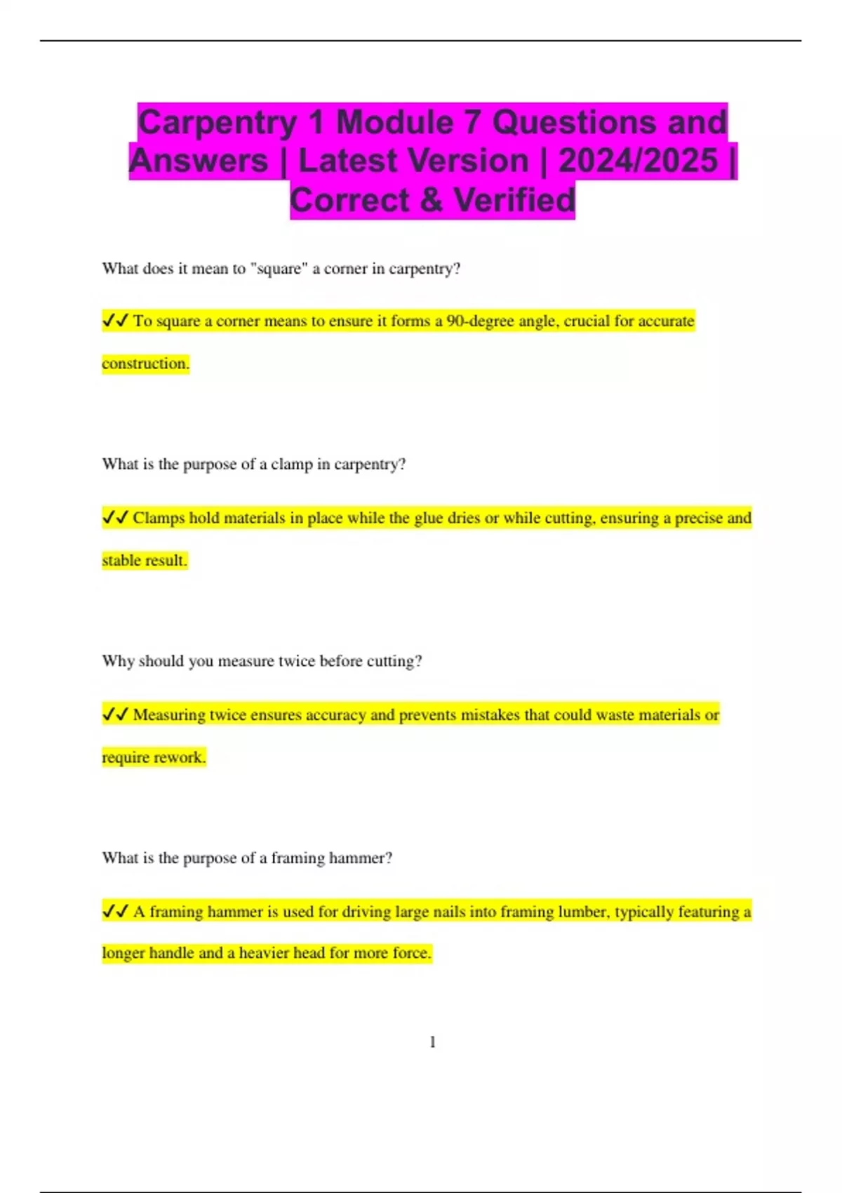 Carpentry 1 Module 7 Questions and Answers | Latest Version | 2024/2025 | Correct & Verified What does it mean to "square" a corner in carpentry? To square a corner means to ensure it forms a 90-degree angle, crucial for accurate construction. What is the purpose of a clamp in carpentry? Clamps hold materials in place while the glue dries or while cutting, ensuring a precise and stable result. Why should you measure twice before cutting? Measuring twice ensures accuracy and prevents mistakes that could waste materials or require rework. What is the purpose of a framing hammer? A framing hammer is used for driving large nails into framing lumber, typically featuring a longer handle and a heavier head for more force. 2 How can you prevent wood from splintering when cutting? Use painter’s tape or a fine-toothed blade, and make the cut slowly to minimize splintering. What is a pocket hole joint, and when is it used? A pocket hole joint is used to join two pieces of wood at an angle, often when a concealed joint is desired. What should you do if you encounter a twisted or warped piece of lumber? Replace the warped or twisted piece to ensure structural integrity and proper alignment in your project. What is the purpose of using a level during framing? A level ensures that vertical and horizontal components of the framing are properly aligned, preventing structural issues. What does "fitting" mean in carpentry? "Fitting" refers to the process of adjusting pieces of wood so they fit together correctly and precisely in the design. 3 Why is it important to have proper ventilation when working with certain finishing materials? Proper ventilation reduces exposure to harmful fumes and ensures a safer work environment when using paints, varnishes, or adhesives. What is the purpose of a framing square in carpentry? A framing square is used to measure and mark right angles, square edges, and make other precise measurements during framing tasks. What is the function of a chalk line in carpentry? A chalk line is used to mark straight lines on surfaces, often for cutting or alignment purposes. Why is it important to check the level of a surface before framing? Ensuring surfaces are level prevents structural problems and ensures proper alignment during construction. What does "plumb" mean in carpentry? "Plumb" refers to a vertical alignment, ensuring that a structure or component is perfectly straight up and down. 4 How do you properly use a tape measure