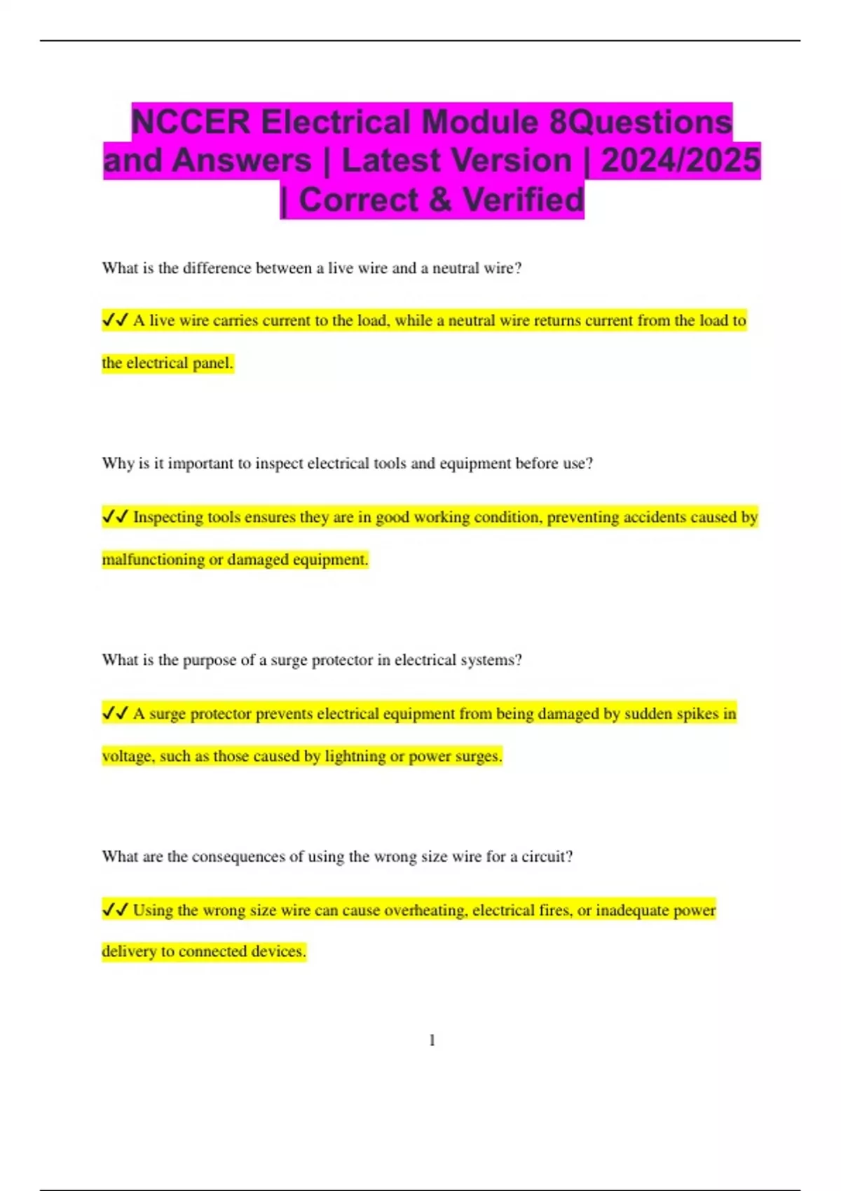 NCCER Electrical Module 8Questions and Answers | Latest Version | 2024/2025 | Correct & Verified What is the difference between a live wire and a neutral wire? A live wire carries current to the load, while a neutral wire returns current from the load to the electrical panel. Why is it important to inspect electrical tools and equipment before use? Inspecting tools ensures they are in good working condition, preventing accidents caused by malfunctioning or damaged equipment. What is the purpose of a surge protector in electrical systems? A surge protector prevents electrical equipment from being damaged by sudden spikes in voltage, such as those caused by lightning or power surges. What are the consequences of using the wrong size wire for a circuit? Using the wrong size wire can cause overheating, electrical fires, or inadequate power delivery to connected devices. 2 What is the function of an arc fault circuit interrupter (AFCI)? An AFCI detects and interrupts arcing faults that could lead to fires, enhancing safety in electrical systems. What is the significance of using a lockout/tagout procedure in electrical work? Lockout/tagout procedures ensure that electrical circuits are de-energized and cannot be accidentally re-energized during maintenance, protecting workers from electrical hazards. What is the role of a capacitor in an electrical motor circuit? A capacitor helps start the motor and improve its running efficiency by providing a phase shift for the motor windings. How do you calculate the total resistance in a parallel circuit? In a parallel circuit, the total resistance is calculated by taking the reciprocal of the sum of the reciprocals of each individual resistance. What is the difference between an electrical short circuit and an overload? A short circuit occurs when there is an unintended path for current to flow, while an overload happens when the current exceeds the capacity of the circuit. 3 Why is it important to follow the National Electrical Code (NEC) in electrical installations? Following the NEC ensures that electrical systems are installed safely, reducing the risk of electrical hazards and ensuring code compliance. What is the role of an isolator switch in an electrical system? An isolator switch physically disconnects equipment from the power supply, ensuring safe maintenance or repair of electrical systems. What is the function of a relay in a motor control system?