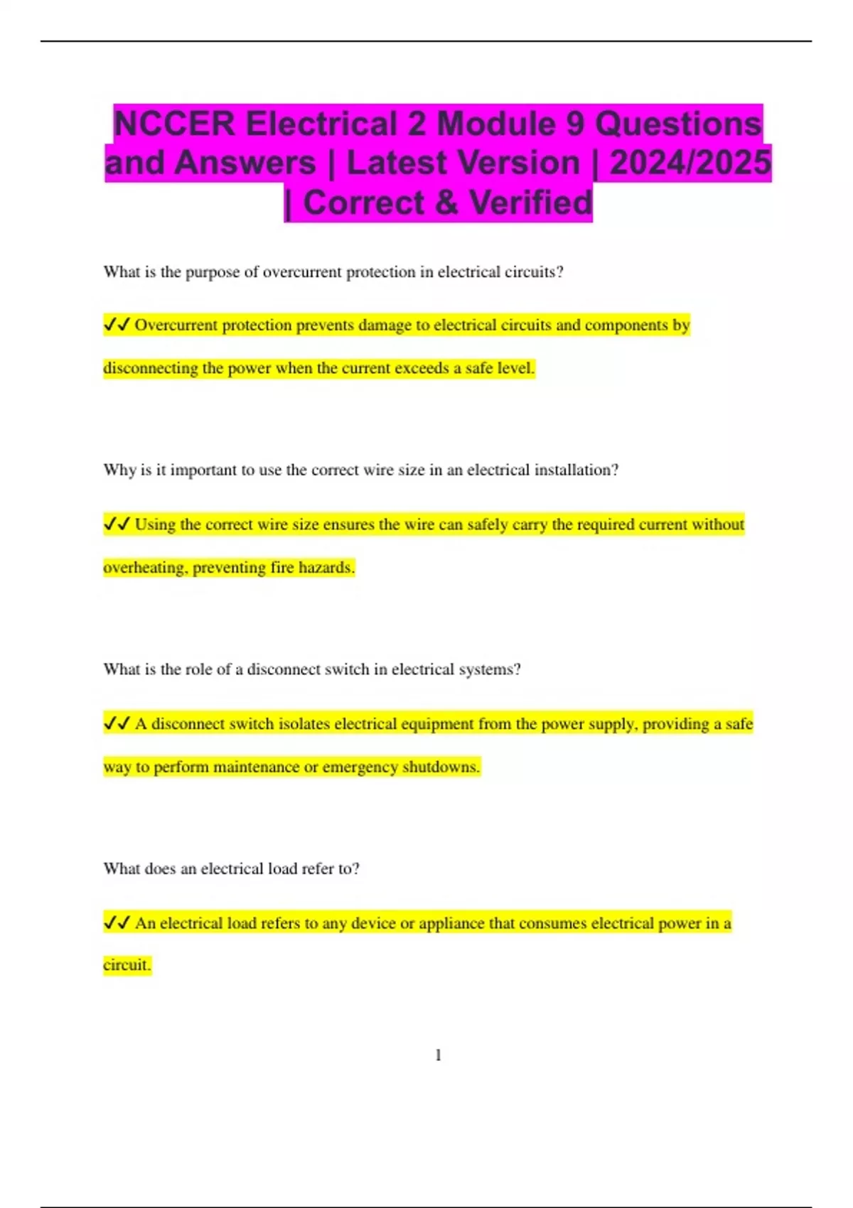 NCCER Electrical 2 Module 9 Questions and Answers | Latest Version | 2024/2025 | Correct & Verified What is the purpose of overcurrent protection in electrical circuits? Overcurrent protection prevents damage to electrical circuits and components by disconnecting the power when the current exceeds a safe level. Why is it important to use the correct wire size in an electrical installation? Using the correct wire size ensures the wire can safely carry the required current without overheating, preventing fire hazards. What is the role of a disconnect switch in electrical systems? A disconnect switch isolates electrical equipment from the power supply, providing a safe way to perform maintenance or emergency shutdowns. What does an electrical load refer to? An electrical load refers to any device or appliance that consumes electrical power in a circuit. 2 What is the purpose of a ground fault circuit interrupter (GFCI)? A GFCI detects and interrupts current flow when it senses a ground fault, helping to prevent electrical shock. Why is proper conduit installation important in electrical wiring? Proper conduit installation protects electrical wiring from physical damage and environmental factors, ensuring the safety and longevity of the system. What is a transformer’s role in electrical systems? A transformer changes the voltage level in an electrical circuit, either stepping it up or stepping it down for safe use. How does a capacitor improve power factor in an electrical system? A capacitor helps to correct power factor by providing reactive power, thus improving energy efficiency and reducing losses. What is the function of a circuit breaker panel? A circuit breaker panel houses circuit breakers that protect circuits from overloads by interrupting the flow of electricity when necessary. 3 What is the importance of bonding in an electrical system? Bonding ensures all metal parts of the electrical system are at the same electrical potential, reducing the risk of electric shock. Why is it important to test electrical connections after installation? Testing ensures that all connections are secure and free from faults, ensuring safe and reliable operation of the electrical system. What is a relay’s function in an electrical control system? A relay is an electrically operated switch that allows one circuit to control another, often used for controlling high-power devices. What does a multimeter measure in an electrical circuit? A multimeter measures voltage, current, and resistance in an electrical circuit, helping troubleshoot and diagnose issues. What is the difference between a grounding electrode and a grounding conductor? 4 A grounding electrode connects the electrical system to the earth, while a grounding conductor connects the system’s components