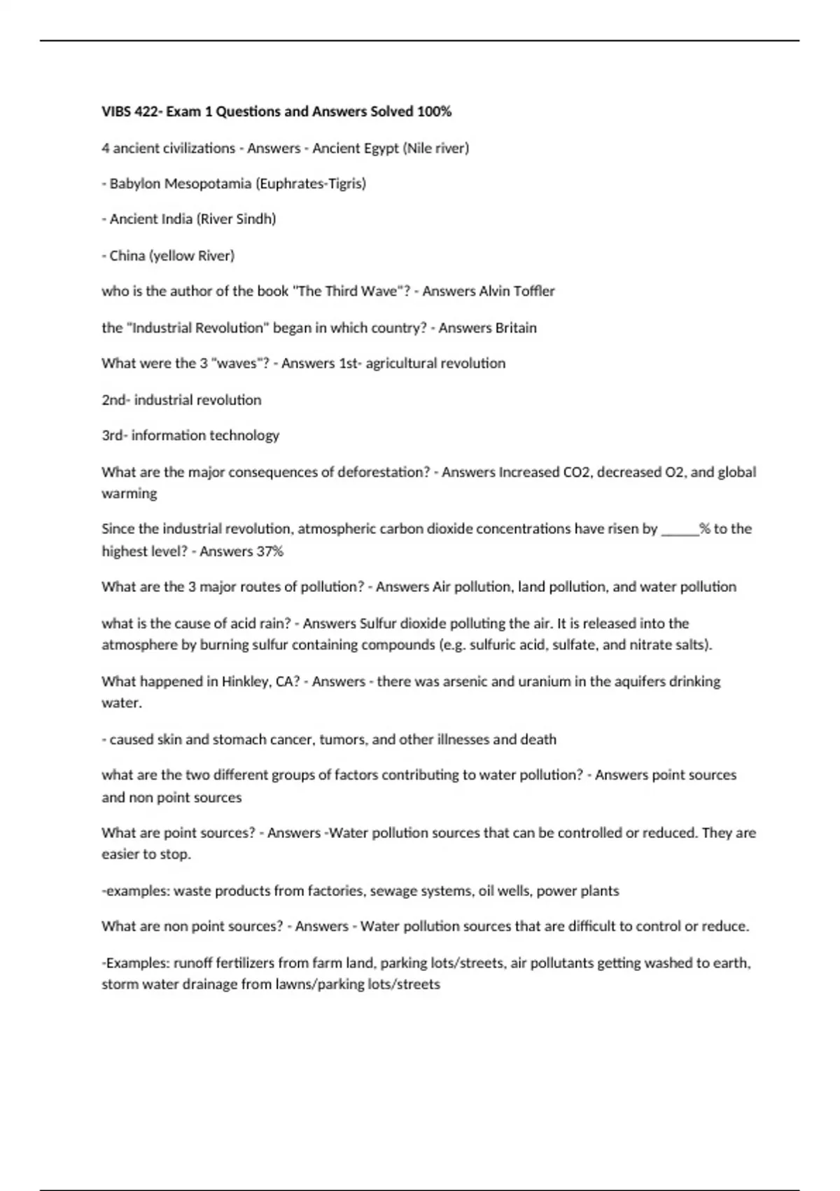VIBS 422- Exam 1 Questions and Answers Solved 100% 4 ancient civilizations - Answers - Ancient Egypt (Nile river) - Babylon Mesopotamia (Euphrates-Tigris) - Ancient India (River Sindh) - China (yellow River) who is the author of the book "The Third Wave"? - Answers Alvin Toffler the "Industrial Revolution" began in which country? - Answers Britain What were the 3 "waves"? - Answers 1st- agricultural revolution 2nd- industrial revolution 3rd- information technology What are the major consequences of deforestation? - Answers Increased CO2, decreased O2, and global warming Since the industrial revolution, atmospheric carbon dioxide concentrations have risen by _____% to the highest level? - Answers 37% What are the 3 major routes of pollution? - Answers Air pollution, land pollution, and water pollution what is the cause of acid rain? - Answers Sulfur dioxide polluting the air. It is released into the atmosphere by burning sulfur containing compounds (e.g. sulfuric acid, sulfate, and nitrate salts). What happened in Hinkley, CA? - Answers - there was arsenic and uranium in the aquifers drinking water. - caused skin and stomach cancer, tumors, and other illnesses and death what are the two different groups of factors contributing to water pollution? - Answers point sources and non point sources What are point sources? - Answers -Water pollution sources that can be controlled or reduced. They are easier to stop. -examples: waste products from factories, sewage systems, oil wells, power plants What are non point sources? - Answers - Water pollution sources that are difficult to control or reduce. -Examples: runoff fertilizers from farm land, parking lots/streets, air pollutants getting washed to earth, storm water drainage from lawns/parking lots/streets Significance of the water contamination in the great lakes - Answers - the great lakes are contaminated with PCBs - therefore, the fish are also contaminated - local residents eating the fish have higher amounts of PCBs in their bodies and thus experience many related health effects Explain the importance of the Flint water chrisis - Answers - Flint river was contaminated with lead (a heavy metal neurotoxin) and created a serious public health danger - the water was treated improperly and this caused the lead from aging pipes to leach into the water supply - 6,000-12,000 children have been exposed Define EDCs. - Answers Endocrine Disrupting chemicals are man-made, synthetic chemicals and natural phytoestrogens that act on the endocrine systems of humans and animals by mimicking, blocking, and/or interfering in some manner with the natural instructions of hormones to cells. Briefly describe the key mechanisms of EDCs. - Answers Mimicking the effects of natural hormones by recognizing their binding sites (receptors). - antagonizing the effects of these hormones by blocking their interaction with their physiological binding sites - reacting directly and indirectly with the hormone in question - altering the natural pattern of synthesis of hormones - altering hormone receptor levels Name any 3 EDCs that are highly predominant in day to day life - Answers - Herbicides (Ex. Atrazine) - Insecticides (Ex. DDT and metabolites) - Industrial chemicals (Ex. Dioxins, phthalates, styrenes) - Tobacco smoke - hormones - pesticides - pharmaceuticals - industrial by-products - antibacterials - personal care products and medical tubing - childrens products What is the drawback in producing GM crops? - Answers Pesticides can damage crops and poison birds, animals, and fish. Most pesticides kill or damage life forms other than those intended. what part of the body has maximal absorption of PBCs? - Answers - the head (4x more absorbent) - the genital area (11x more absorbent) Name 2 naturally occuring EDCs. - Answers Phytoestrogens and fungal estrogens What effect has DDT had on eagles? - Answers - Eggshell thinning - decreased reproduction why are children more susceptible to EDCs? - Answers - absorb more pesticides from their environment than adults (play close to ground, touch eyes/mouth/nose) - they are less able to detoxify and excrete pesticides because of their less developed immune system - all children are exposed to toxic synthetic chemicals before birth and continue to be exposed for the rest of their lives Explain endocrine, paracrine, autocrine, and neurocrine hormones. - Answers - Endocrine = acts as a site distant from the secreting cell/gland - Paracrine = acts on a cell near the secreting cell - Autocrine = acts on secreting cell - Neurocrine = secreted by neural cells (Ex. Neurotransmitters and neurohormones) Describe peptide hormone signaling. - Answers 1. the hormone binds to a site on the extracellular portion of the receptor 2. The receptors are seven transmembrane proteins that pass through the plasma membrane 7 times 3. N-terminal exposed at the exterior of the cell and C terminal projecting into the cytoplasm 4. Binding of the hormone to the receptor activates a G protein 5. This initiates the production of a "second messenger" which is produced by adenylyl cyclase 6. The second messenger initiates a series of intracellular events such as phosphorylation and activation of enzymes; release of Ca2+ into the cytosol from stores within the ER 7. These enzymatic changes activate the transcription factor CREB Describe steroid hormone signaling. - Answers -Made from cholesterol, are lipophilic and can enter target cell -Immediately released from cell after synthesis -Interact with cytoplasmic or nuclear receptors -Activate DNA for protein synthesis -Are slower acting and have longer half life than peptide hormones Action: 1. Most hydrophobic steroids are boind to plasma protein carriers. Only unbound hormones can diffuse into the target cell 2. Steroid hormone receptors are in the cytoplasm or nucleus 3. The receptor hormone complex binds to DNA and activates or represses one or more genes 4. Activated genes create new MRNA that moves back to the 