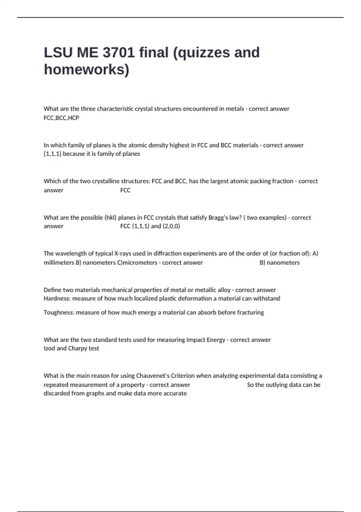 What are the three characteristic crystal structures encountered in metals - correct answer FCC,BCC,HCP In which family of planes is the atomic density highest in FCC and BCC materials - correct answer {1,1,1} because it is family of planes Which of the two crystalline structures: FCC and BCC, has the largest atomic packing fraction - correct answer FCC What are the possible (hkl) planes in FCC crystals that satisfy Bragg's law? ( two examples) - correct answer FCC (1,1,1) and (2,0,0) The wavelength of typical X-rays used in diffraction experiments are of the order of (or fraction of): A) millimeters B) nanometers C)micrometers - correct answer B) nanometers Define two materials mechanical properties of metal or metallic alloy - correct answer Hardness: measure of how much localized plastic deformation a material can withstand Toughness: measure of how much energy a material can absorb before fracturing What are the two standard tests used for measuring Impact Energy - correct answer Izod and Charpy test What is the main reason for using Chauvenet's Criterion when analyzing experimental data consisting a repeated measurement of a property - correct answer So the outlying data can be discarded from graphs and make data more accurate briefly describe the measurement of Rockwell hardness of a material - correct answer measures the depth of penetration of an indenter under a large load (major load) compared to the penetration made by a preload (minor load). Why do we apply the minor load during a Rockwell hardness measurement - correct answer to allow the indenter to penetrate the material surface, thus eliminating any errors causes by surface roughness. Briefly explain the differences between [1 1 1], (1 1 1), <1 1 1> and {1 1 1}. - correct answer (111)-coordinates of specific plane [111]-specific direction {111}-family of planes <111>-family of directions Expressions for engineering stress(o-) and engineering strain(e): load(force) P, the initial cross-sectional area Ao, initial length Lo, final Length L. - correct answer o- = P/Ao e = L - Lo/Lo What is the modulus of elasticity (E) and how would you calculate its value - correct answer E = o-(engineering stress) / e(engineering strain) the ratio of stress, below the proportional limit, to the corresponding strain. Define the Yield strength of the steel specimen and describe the procedure you would use to find the yield strength from stress-strain graph - correct answer the stress at which a predetermined amount of permanent deformation occurs. The results of the test are plotted on stress-strain curve. The stress at the point where the stress-strain curve deviates from proportionality is the yield strength of the material. What is the modulus of resilience - correct answer the area under the curve up to the yield strength When loading a specimen in tension what do we call the stress level beyond which the necking starts to occur - correct answer Ultimate or Tensile Strength The two components of pearlite are - correct answer ferrite and cementite How would you perform a normalizing heat treatment of a steel specimen - correct answer heat treating the specimen then allowing it to air cool Jominy end-quench test consists of: - correct answer Selectively water cooling of a standard size bar of steel Which of the two processes will yield a higher value of toughness: quenching or annealing - correct answer Annealing What are the characteristic features of martensite - correct answer high hardness and good toughness Describe briefly the process of precipitation hardening heat treatment process - correct answer solution treatment which heats the material above solvus temp then moves to quenching which cools the material and then it is age hardened which heats the material to below solvus temp which produces a precipitate What are the three heat treatment steps involved in precipitation hardening process of Aluminum alloys - correct answer 1. solution treatment 2. Quenching 3. Age hardening Briefly describe what happens in the alloy during the solution treatment process - correct answer alloy is heated to above the solvus temp and soaked there until a homogeneous solid solution (a) is produced. Why does the formation of precipitates strengthen the heat treated alloys - correct answer blocks dislocations from moving What are the materials we call polymers and how are they obtained - correct answer high molecular weight materials (rubbers and plastics) that are synthesized from simple organic compounds. typically low strength and ductile What are the major differences between a thermosetting ,thermoplastics , and elastomers - correct answer The way they are linked together. Thermosetting - composed of cross-linked space networks. Crosslinks form between chains when the material is cured. Thermoplastics - composed of long coiling chains which are NOT cross-linked. Elastomers - long chained elastomers do not crosslink Which of the following is NOT a property characterizing teflon: a) teflon has fluorine in its composition b) teflon has chlorine in its composition c) teflon has good sealing characteristics - correct answer b) teflon has chlorine in its composition Which of the three types of polymers (thermosetting ,thermoplastics , and elastomers) forms permanent cross-links between chains and can not be recycled - correct answer Thermosettings What is the stress relaxation in polymers and how does it differ from creep - correct answer stress relaxation - decrease in the amount of stress required to maintain a specific strain Creep - deformation continues to occur under conditions of constant stress. What is ductile to brittle transition - correct answer transition of a metal being heated or cooled and having different fractures at different temps Describe the ductile fracture - correct answer cup and cone fracture which means there is a lot of plastic deformation leading up to the fracture describe brittle fracture - correct answer a clean, fine fra