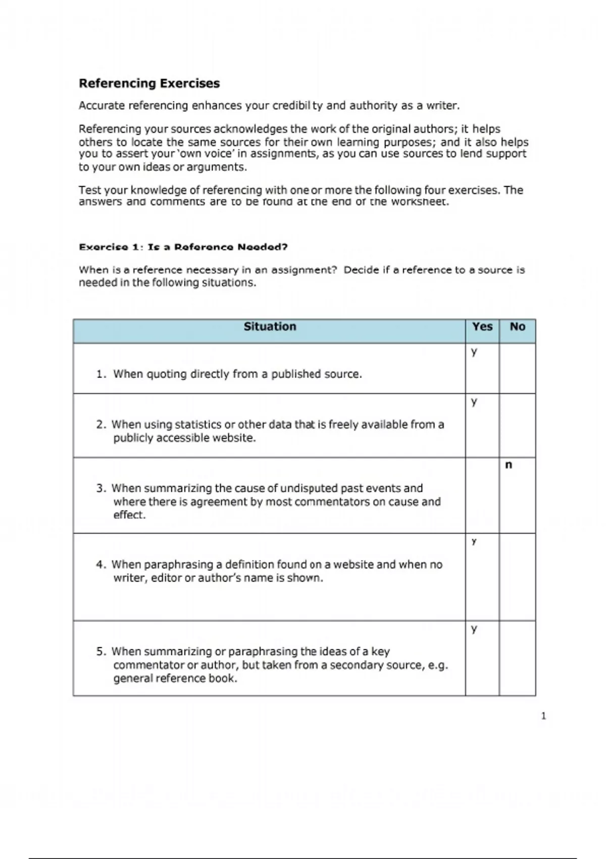 Referencing Exercises Accurate referencing enhances your credibility and authority as a writer. Referencing your sources acknowledges the work of the original authors; it helps others to locate the same sources for their own learning purposes; and it also helps you to assert your ‘own voice’ in assignments, as you can use sources to lend support to your own ideas or arguments. Test your knowledge of referencing with one or more the following four exercises. The answers and comments are to be found at the end of the worksheet.