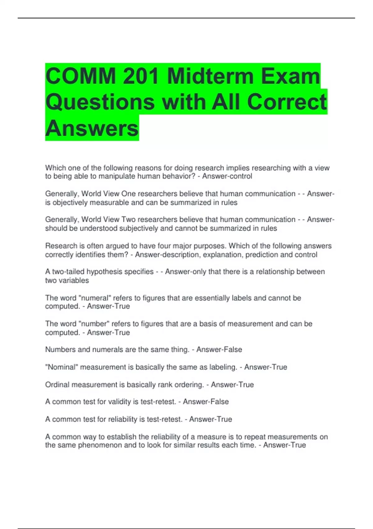 COMM 201 Midterm Exam Questions with All Correct Answers Which one of the following reasons for doing research implies researching with a view to being able to manipulate human behavior? - Answer-control Generally, World View One researchers believe that human communication - - Answer-is objectively measurable and can be summarized in rules Generally, World View Two researchers believe that human communication - - Answer-should be understood subjectively and cannot be summarized in rules Research is often argued to have four major purposes. Which of the following answers correctly identifies them? - Answer-description, explanation, prediction and control A two-tailed hypothesis specifies - - Answer-only that there is a relationship between two variables The word "numeral" refers to figures that are essentially labels and cannot be computed. - Answer-True The word "number" refers to figures that are a basis of measurement and can be computed. - Answer-True Numbers and numerals are the same thing. - Answer-False "Nominal" measurement is basically the same as labeling. - Answer-True Ordinal measurement is basically rank ordering. - Answer-True A common test for validity is test-retest. - Answer-False A common test for reliability is test-retest. - Answer-True A common way to establish the reliability of a measure is to repeat measurements on the same phenomenon and to look for similar results each time. - Answer-True "Expert" or "panel" validity means that a group of experts have determined that a measure is valid. - Answer-True Intercoder reliability means that Observer A and Observer B record the same thing if they are both observing it at the same time. - Answer-True Face validity means basically that a measure appears to measure what it is supposed to. - Answer-True Predictive validity means that a measure predicts "real world" outcomes. - Answer-True Measuring communication phenomena at the nominal or ordinal levels allows us to classify and rank them. - Answer-True Measuring communication phenomena at the nominal or ordinal levels allows us to use statistics as a reporting tool. - Answer-False Measuring communication at the interval and ratio levels allows us to use statistics as a reporting tool. - Answer-True Concurrent validity means scores on a measure correlate highly with other measures designed to measure exactly the same construct. - Answer-True Divergent validity means scores on a measure accurately predict "real world" outcomes. - Answer-False Likert and semantic differential questions have the same format. - Answer-False Likert-format questions use a scale anchored by words with opposite meanings. - Answer-False Semantic differential-format questions use a scale anchored by "strongly agree" and "strongly disagree." - Answer-False