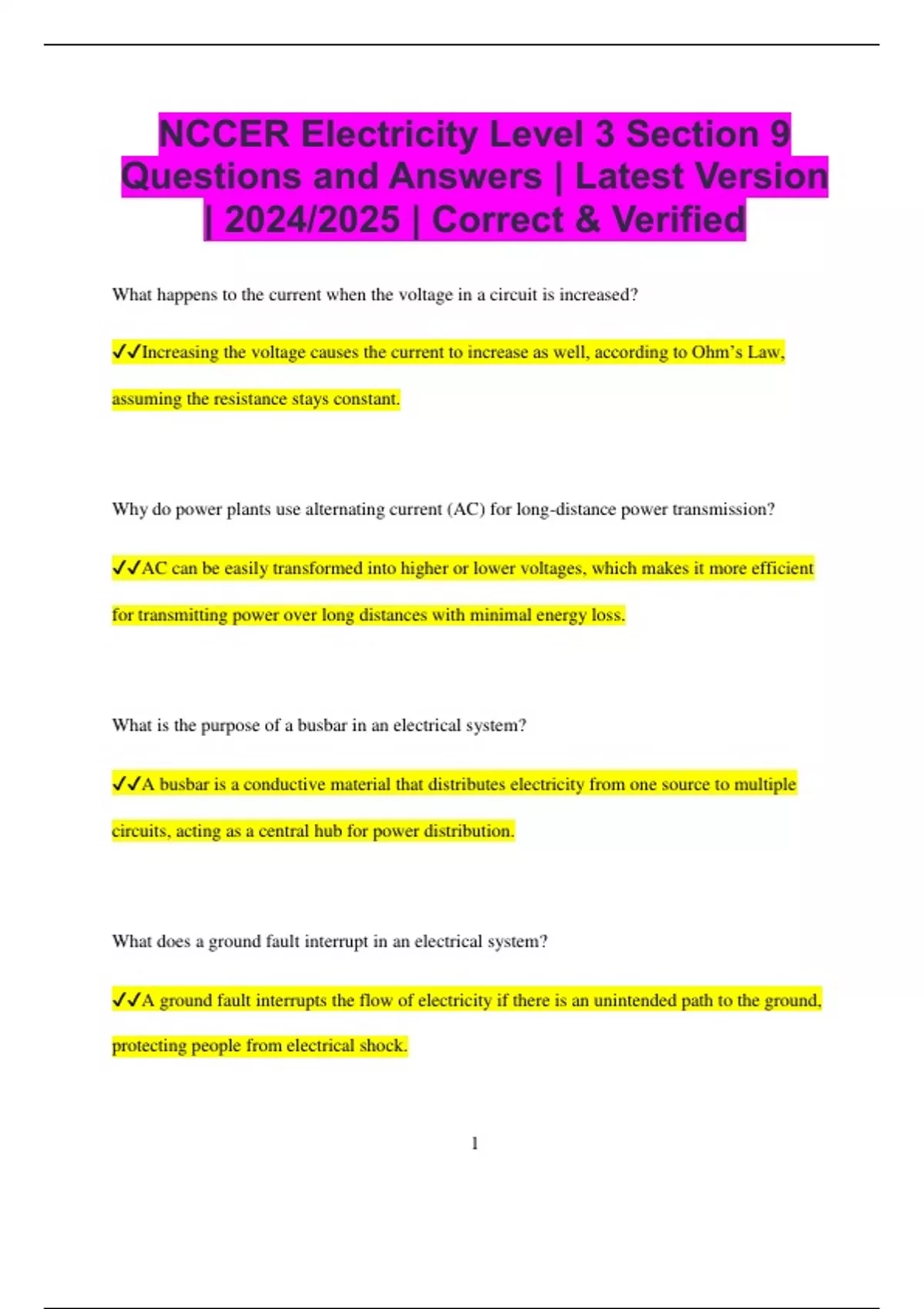 NCCER Electricity Level 3 Section 9 Questions and Answers | Latest Version | 2024/2025 | Correct & Verified What happens to the current when the voltage in a circuit is increased? Increasing the voltage causes the current to increase as well, according to Ohm’s Law, assuming the resistance stays constant. Why do power plants use alternating current (AC) for long-distance power transmission? AC can be easily transformed into higher or lower voltages, which makes it more efficient for transmitting power over long distances with minimal energy loss. What is the purpose of a busbar in an electrical system? A busbar is a conductive material that distributes electricity from one source to multiple circuits, acting as a central hub for power distribution. What does a ground fault interrupt in an electrical system? A ground fault interrupts the flow of electricity if there is an unintended path to the ground, protecting people from electrical shock. 2 What is a variable frequency drive (VFD) used for in electrical systems? A VFD is used to control the speed and torque of an electric motor by adjusting the frequency of the power supply. How does a light dimmer switch work? A dimmer switch works by adjusting the power supplied to the light, often by chopping the AC waveform to reduce the amount of energy delivered. What could happen if you connect a 240V device to a 120V outlet? The device may not work properly or could be damaged, as it is receiving less voltage than it requires for operation. Why are insulated wires used in electrical circuits? Insulated wires prevent accidental contact with conductive materials or other wires, reducing the risk of electrical shock or short circuits. What does a wattmeter measure? A wattmeter measures the amount of power, in watts, that is being used in a circuit. 3 What is the role of a neutral wire in a circuit? A neutral wire provides a return path for the current to the power source, completing the circuit. What is the purpose of an electrical panel in a home or building? An electrical panel houses the circuit breakers or fuses, providing a central point for distributing electrical power to various circuits in the building. Why is it dangerous to bypass a circuit breaker or fuse? Bypassing a circuit breaker or fuse removes the protection against overloads, which could lead to overheating, fire, or damage to electrical components. What is the difference between a conductor