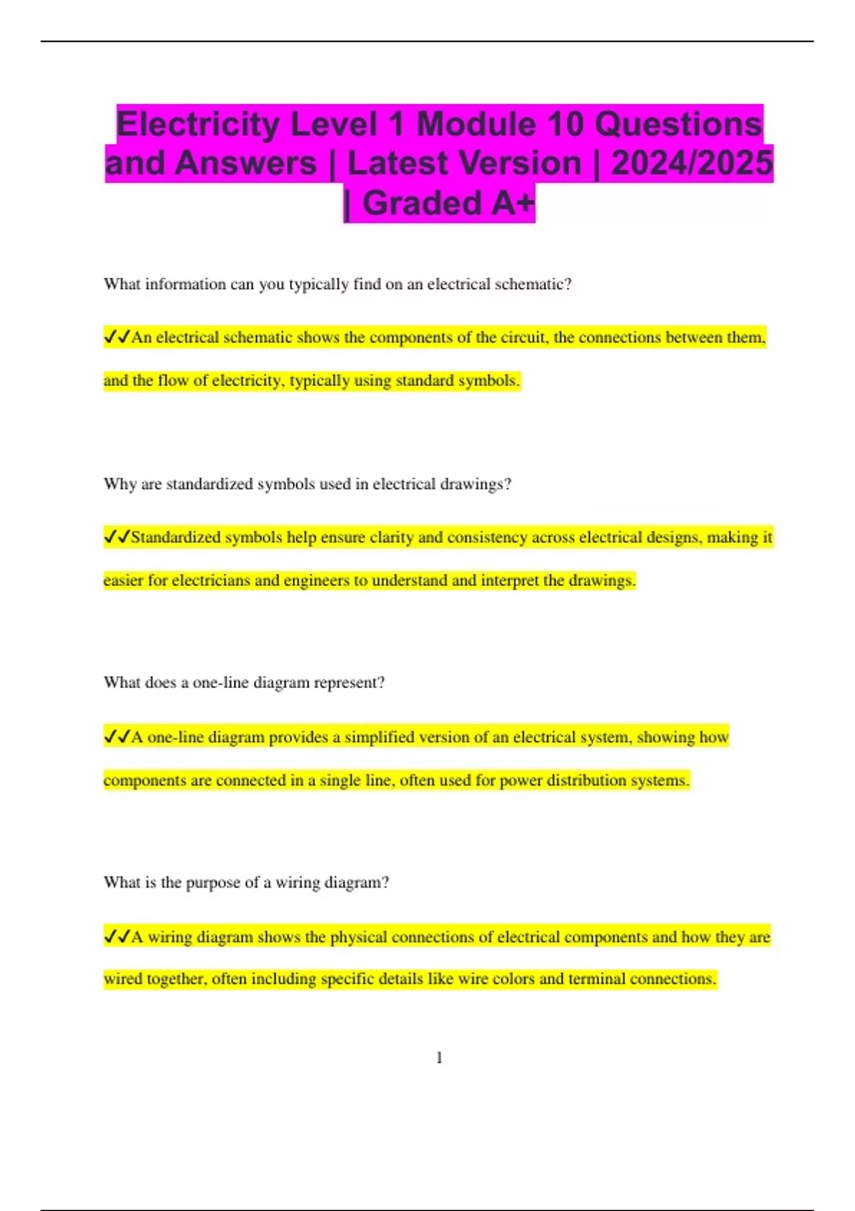 Electricity Level 1 Module 10 Questions and Answers | Latest Version | 2024/2025 | Graded A+ What information can you typically find on an electrical schematic? An electrical schematic shows the components of the circuit, the connections between them, and the flow of electricity, typically using standard symbols. Why are standardized symbols used in electrical drawings? Standardized symbols help ensure clarity and consistency across electrical designs, making it easier for electricians and engineers to understand and interpret the drawings. What does a one-line diagram represent? A one-line diagram provides a simplified version of an electrical system, showing how components are connected in a single line, often used for power distribution systems. What is the purpose of a wiring diagram? A wiring diagram shows the physical connections of electrical components and how they are wired together, often including specific details like wire colors and terminal connections. 2 What is the role of a panel schedule in electrical drawings? A panel schedule lists the circuits and breakers for an electrical panel, indicating which circuits each breaker controls and the electrical loads they support. How do electrical drawings assist with safety? Electrical drawings help ensure the correct placement and protection of circuits, identify potential hazards, and provide clear instructions for safe installation and maintenance. What is the difference between a schematic and a wiring diagram? A schematic shows the electrical logic and flow, while a wiring diagram shows the actual physical wiring connections between components in a system. Why are dimensioning and scaling important in electrical drawings? Dimensioning and scaling help accurately represent the size and placement of electrical components, ensuring proper installation and fit within a space. What is the purpose of a riser diagram in electrical drawings? 3 A riser diagram shows the vertical relationships between electrical components in a building, such as how circuits run between different floors or levels. What does the abbreviation "GFCI" stand for, and where might it be shown in electrical drawings? GFCI stands for Ground Fault Circuit Interrupter, and it may be shown in electrical drawings to indicate areas where protection against electrical faults is required. What type of information does an electrical plan typically include? An electrical plan includes the layout of outlets, switches, light fixtures, and electrical panels, showing how electrical components will be installed throughout a building. How can electrical drawings help with troubleshooting electrical systems? Electrical drawings provide a clear map of the system’s layout, allowing technicians to identify faulty connections or components quickly during troubleshooting. What does a line diagram show in an electrical drawing? A line diagram shows the power flow in the system, with lines representing conductors and other symbols indicating electrical components