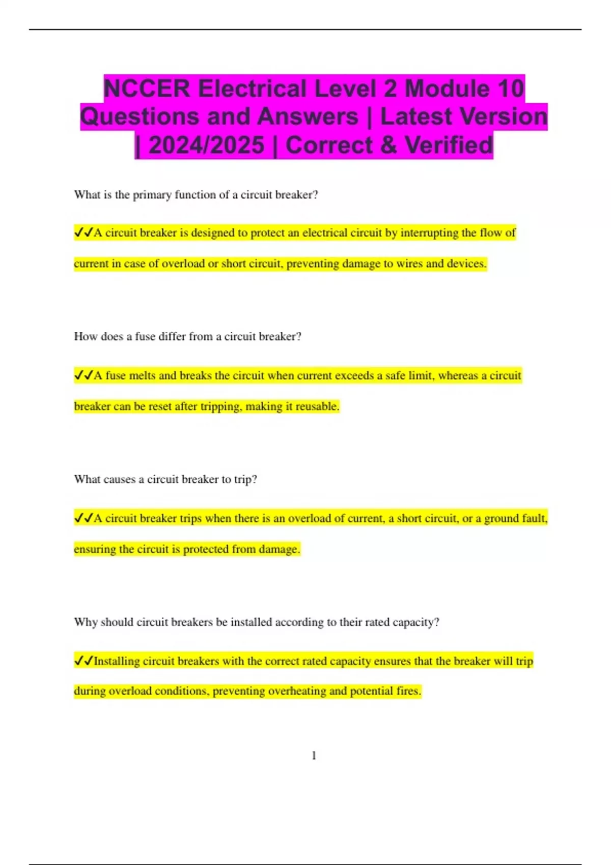NCCER Electrical Level 2 Module 10 Questions and Answers | Latest Version | 2024/2025 | Correct & Verified What is the primary function of a circuit breaker? A circuit breaker is designed to protect an electrical circuit by interrupting the flow of current in case of overload or short circuit, preventing damage to wires and devices. How does a fuse differ from a circuit breaker? A fuse melts and breaks the circuit when current exceeds a safe limit, whereas a circuit breaker can be reset after tripping, making it reusable. What causes a circuit breaker to trip? A circuit breaker trips when there is an overload of current, a short circuit, or a ground fault, ensuring the circuit is protected from damage. Why should circuit breakers be installed according to their rated capacity? Installing circuit breakers with the correct rated capacity ensures that the breaker will trip during overload conditions, preventing overheating and potential fires. 2 What is the role of a fuse in a circuit? A fuse protects the circuit by melting and disconnecting the circuit when the current exceeds the fuse's rated limit, preventing further damage to the system. How does a circuit breaker prevent electrical fires? By automatically interrupting the circuit when excessive current is detected, preventing overheating of the wires and reducing the risk of fire. What are the common types of circuit breakers? The most common types of circuit breakers are standard circuit breakers, ground fault circuit interrupters (GFCIs), and arc fault circuit interrupters (AFCIs). What is a ground fault circuit interrupter (GFCI) breaker designed to do? A GFCI breaker detects differences between the hot and neutral wires, tripping the circuit if it senses a leakage current to the ground, preventing electric shocks. What is the purpose of an arc fault circuit interrupter (AFCI)? An AFCI breaker detects dangerous arc faults in the circuit and trips to prevent electrical fires caused by damaged or faulty wiring. 3 What happens when a fuse blows? When a fuse blows, it creates an open circuit by melting its internal wire, stopping the flow of electricity to the device or circuit it protects. Why is it important to replace a blown fuse with one of the same rating? Replacing a fuse with the same rating ensures that the fuse will protect the circuit properly, preventing the risk of overloading or causing damage. What is the difference between a manual reset and an automatic reset circuit breaker? A manual reset circuit breaker requires the user to