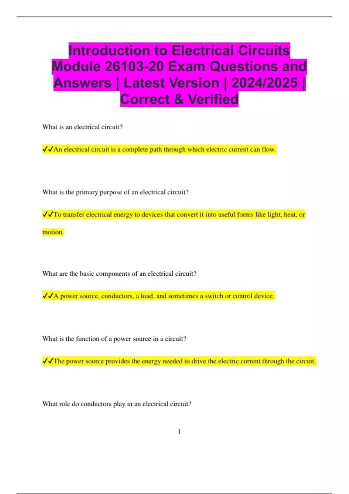 Introduction to Electrical Circuits Module 26103-20 Exam Questions and Answers | Latest Version | 2024/2025 | Correct & Verified What is an electrical circuit? An electrical circuit is a complete path through which electric current can flow. What is the primary purpose of an electrical circuit? To transfer electrical energy to devices that convert it into useful forms like light, heat, or motion. What are the basic components of an electrical circuit? A power source, conductors, a load, and sometimes a switch or control device. What is the function of a power source in a circuit? The power source provides the energy needed to drive the electric current through the circuit. What role do conductors play in an electrical circuit? 2 Conductors allow electric current to flow from the power source to the load and back. What is the function of a load in a circuit? The load is a device that consumes electrical energy, such as a light bulb, motor, or heater. What is the role of a switch in a circuit? A switch controls the flow of electricity by opening or closing the circuit. What does it mean when a circuit is "closed"? A closed circuit means there is a complete path for current to flow, and the circuit is operational. What happens when a circuit is "open"? In an open circuit, the path for current flow is interrupted, so no current flows through the circuit. What is electrical resistance? Electrical resistance is the opposition to the flow of current in a circuit, measured in ohms. 3 What is Ohm’s Law? Ohm’s Law states that the current in a circuit is directly proportional to the voltage and inversely proportional to the resistance (I = V/R). What is the function of a resistor in a circuit? A resistor limits the flow of current and reduces voltage within the circuit. What is the difference between a series circuit and a parallel circuit? In a series circuit, components are connected end-to-end, sharing the same current, while in a parallel circuit, components are connected across the same voltage source and have independent paths for current. What happens if one component fails in a series circuit? If one component fails in a series circuit, the entire