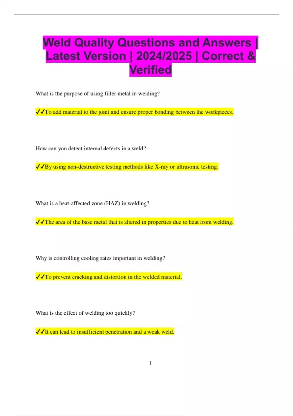 Weld Quality Questions and Answers | Latest Version | 2024/2025 | Correct & Verified What is the purpose of using filler metal in welding? To add material to the joint and ensure proper bonding between the workpieces. How can you detect internal defects in a weld? By using non-destructive testing methods like X-ray or ultrasonic testing. What is a heat-affected zone (HAZ) in welding? The area of the base metal that is altered in properties due to heat from welding. Why is controlling cooling rates important in welding? To prevent cracking and distortion in the welded material. What is the effect of welding too quickly? It can lead to insufficient penetration and a weak weld. 2 Why is electrode storage crucial in welding? Moisture in electrodes can lead to porosity and weld defects. What is meant by weld symmetry? The balance and uniformity of the weld bead on both sides of the joint. Why is preheating sometimes required before welding? To reduce thermal shock and minimize the risk of cracking. What is the purpose of tack welds during joint preparation? To temporarily hold pieces in position before final welding. How can you identify excessive reinforcement in a weld? By measuring the weld bead height and ensuring it is within specification. What is the role of a welding inspector? To evaluate and ensure the weld meets required quality standards and specifications. 3