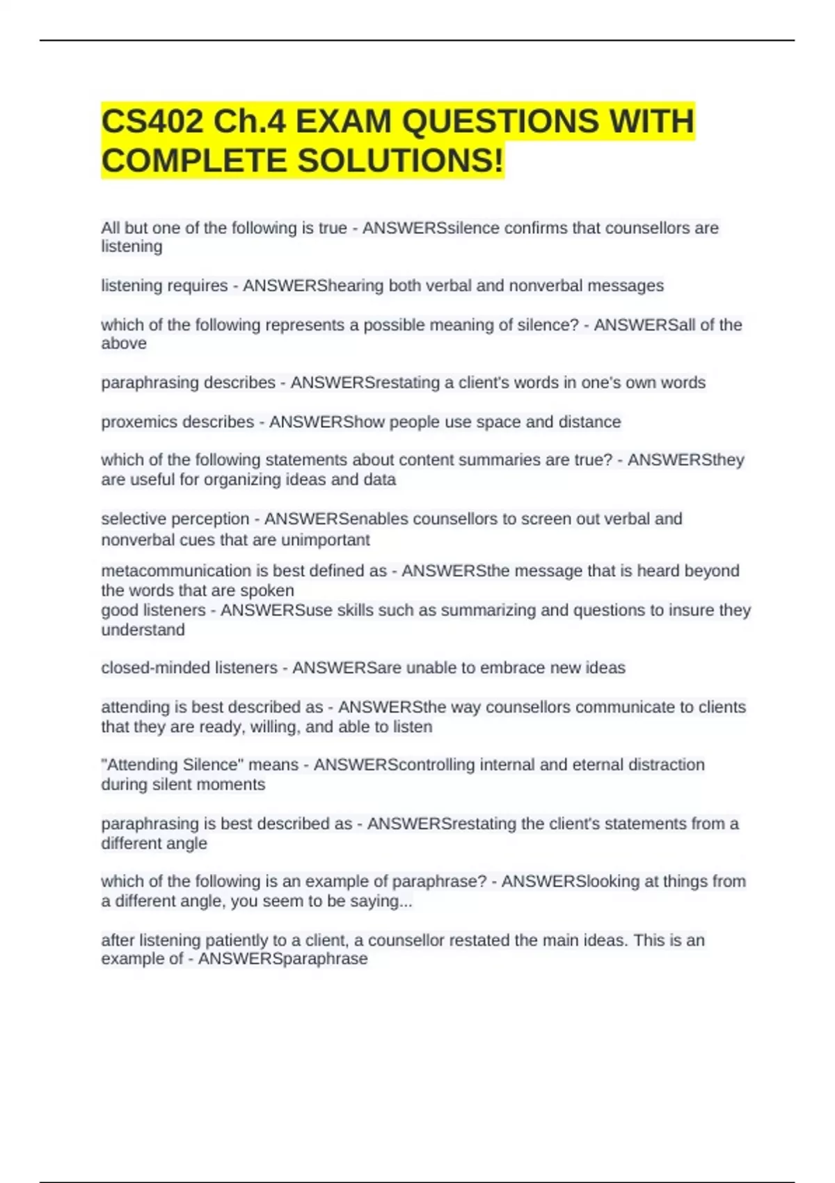All but one of the following is true - ANSWERSsilence confirms that counsellors are listening listening requires - ANSWERShearing both verbal and nonverbal messages which of the following represents a possible meaning of silence? - ANSWERSall of the above paraphrasing describes - ANSWERSrestating a client's words in one's own words proxemics describes - ANSWERShow people use space and distance which of the following statements about content summaries are true? - ANSWERSthey are useful for organizing ideas and data selective perception - ANSWERSenables counsellors to screen out verbal and nonverbal cues that are unimportant metacommunication is best defined as - ANSWERSthe message that is heard beyond the words that are spoken good listeners - ANSWERSuse skills such as summarizing and questions to insure they understand closed-minded listeners - ANSWERSare unable to embrace new ideas attending is best described as - ANSWERSthe way counsellors communicate to clients that they are ready, willing, and able to listen "Attending Silence" means - ANSWERScontrolling internal and eternal distraction during silent moments paraphrasing is best described as - ANSWERSrestating the client's statements from a different angle which of the following is an example of paraphrase? - ANSWERSlooking at things from a different angle, you seem to be saying... after listening patiently to a client, a counsellor restated the main ideas. This is an example of - ANSWERSparaphrase