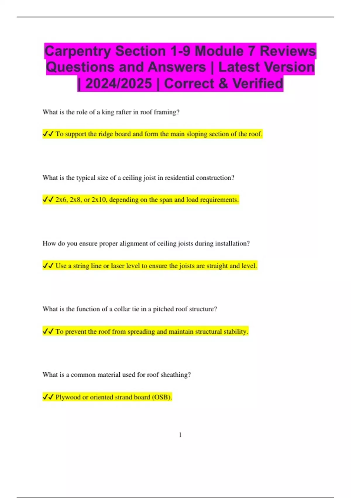 Carpentry Section 1-9 Module 7 Reviews Questions and Answers | Latest Version | 2024/2025 | Correct & Verified What is the role of a king rafter in roof framing? To support the ridge board and form the main sloping section of the roof. What is the typical size of a ceiling joist in residential construction? 2x6, 2x8, or 2x10, depending on the span and load requirements. How do you ensure proper alignment of ceiling joists during installation? Use a string line or laser level to ensure the joists are straight and level. What is the function of a collar tie in a pitched roof structure? To prevent the roof from spreading and maintain structural stability. What is a common material used for roof sheathing? Plywood or oriented strand board (OSB). 2 How does a gambrel roof differ from a traditional gable roof? A gambrel roof has two slopes on each side, with a steeper lower slope and a shallower upper slope. What is the primary benefit of using a flat roof in commercial buildings? It allows for easy installation of HVAC units, skylights, and other rooftop equipment. What is the role of a valley rafter in roof framing? To support the intersection where two sloped roof sections meet at a valley. What is the purpose of using a ridge beam in roof framing? To carry the weight of the roof structure at the peak
