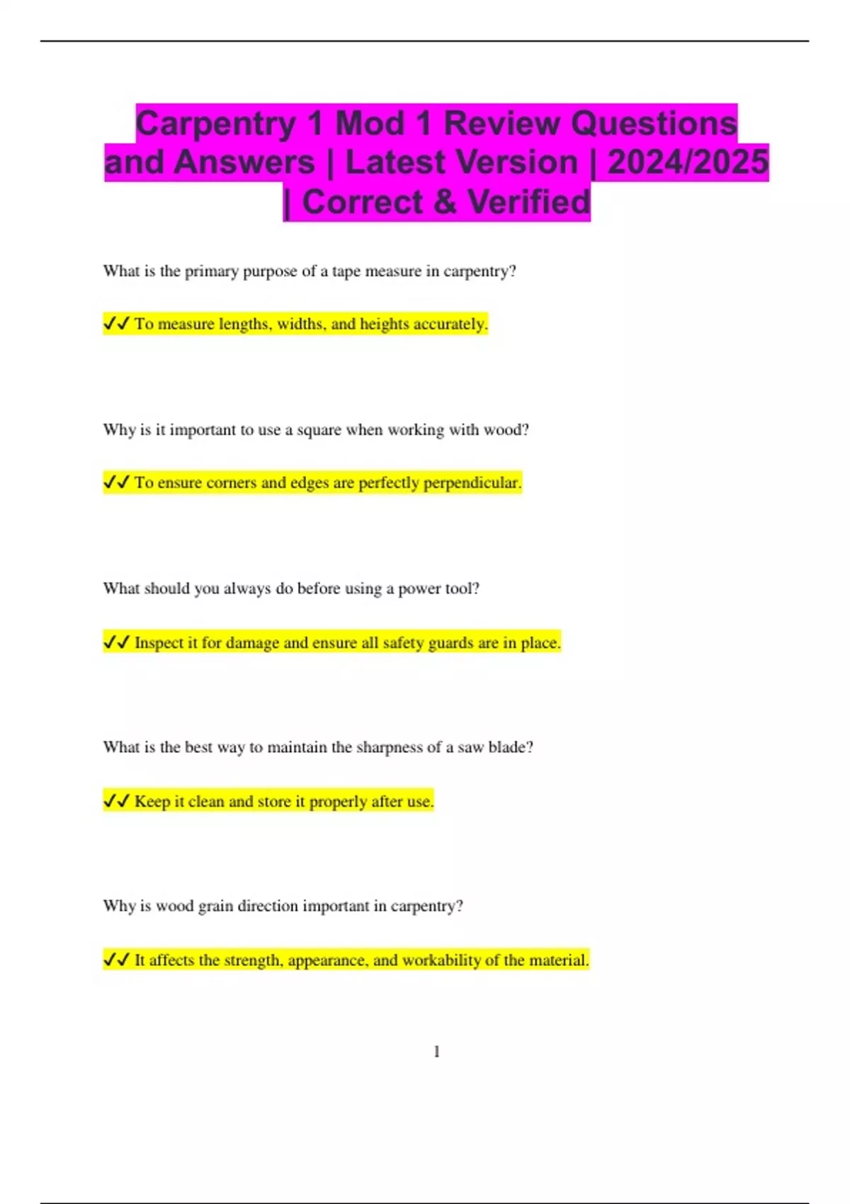 Carpentry 1 Mod 1 Review Questions and Answers | Latest Version | 2024/2025 | Correct & Verified What is the primary purpose of a tape measure in carpentry? To measure lengths, widths, and heights accurately. Why is it important to use a square when working with wood? To ensure corners and edges are perfectly perpendicular. What should you always do before using a power tool? Inspect it for damage and ensure all safety guards are in place. What is the best way to maintain the sharpness of a saw blade? Keep it clean and store it properly after use. Why is wood grain direction important in carpentry? It affects the strength, appearance, and workability of the material. 2 What is the purpose of sanding wood before finishing? To create a smooth surface for paint or stain to adhere to. What type of hammer is most commonly used in carpentry? A claw hammer, which is used for driving and removing nails. What safety gear should always be worn when cutting wood? Safety glasses and hearing protection. Why is it important to mark measurements accurately? To ensure precise cuts and proper assembly. What should you do if a piece of wood splinters while cutting? Stop cutting, inspect the wood, and adjust the tool or technique. What is the purpose of a level in carpentry? To ensure surfaces are perfectly horizontal or vertical. 3 Why is it necessary to drill pilot holes for screws? To prevent the wood from splitting and make screw installation easier. What is the function of a chisel in carpentry? To shape or carve wood by removing small pieces. How can you identify the face grain of a piece of wood? It is the smooth, flat surface with visible grain patterns. What is the purpose of a carpenter’s pencil? To mark measurements and guidelines on wood. Why is it important to use the correct type of nail for a project? Different nails provide varying strengths and are suited for specific materials. What is the role of a miter saw in carpentry? To make precise angled cuts in wood.