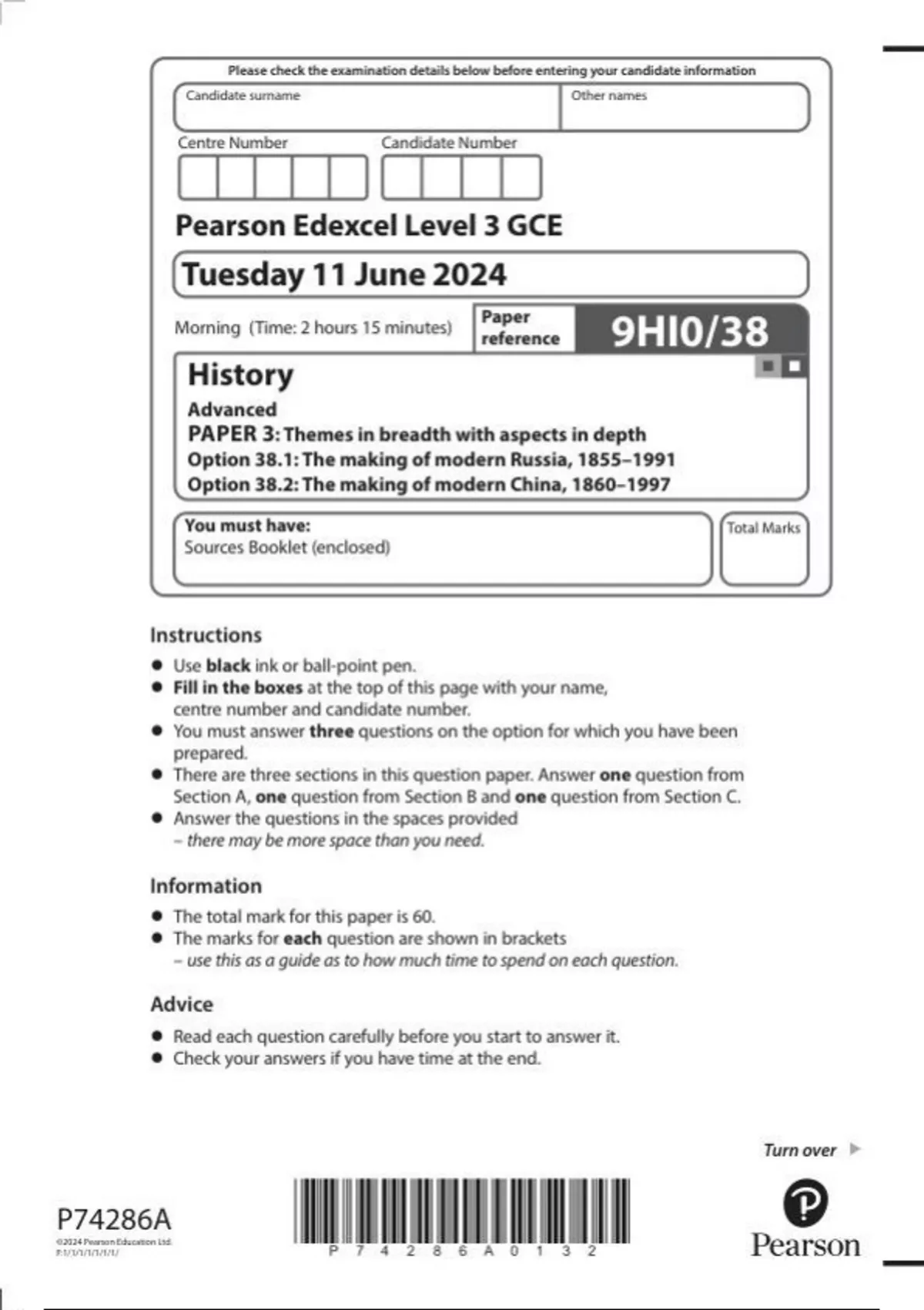 Pearson Edexcel Level 3 GCE History 9hi0-38 Advanced PAPER 3: Themes in breadth with aspects in depth Option 38.1: The making of modern Russia, 1855–1991 Option 38.2: The making of modern China, 1860–1997 question paper june 2024