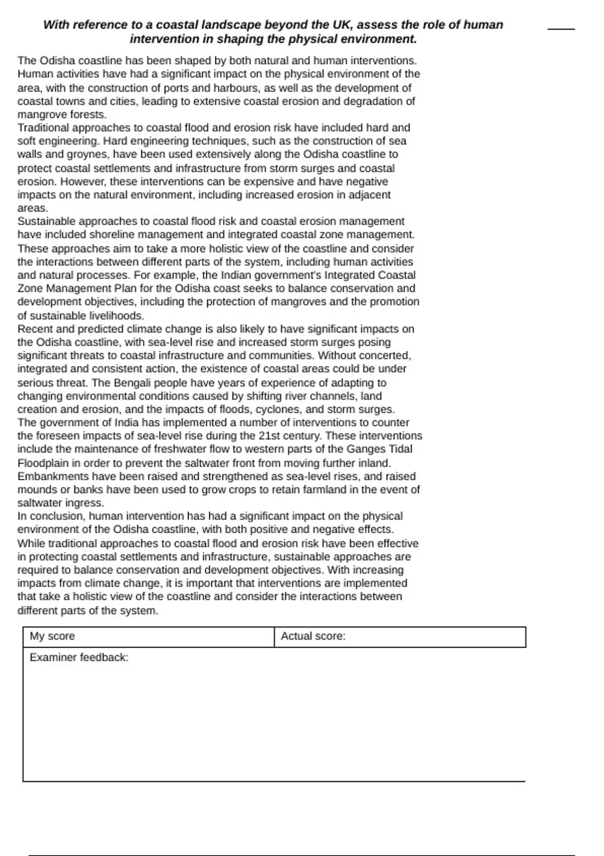 This pack contains two separate answers to the 2022 20-marker “With reference to a coastal landscape from beyond the UK, assess the role of human intervention in shaping the physical environment. ” The pack contains the following; Resources PowerPoint containing two model answers at varying scores and level descriptor from mark scheme.