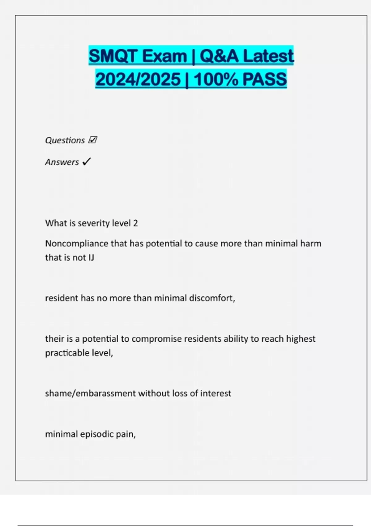 SMQT EXAM ACTUAL 2025/2026 QUESTIONS AND 100% CORRECT ANSWERS What is severity level 2 Noncompliance that has potential to cause more than minimal harm that is not IJ resident has no more than minimal discomfort, their is a potential to compromise residents ability to reach highest practicable level, shame/embarassment without loss of interest minimal episodic pain, facility has no system to prevent problemsNeed assistance on Online classes, Exams & Assignments? Reach out for instant help!! Full Course Assistance, Plagiarism-free Essay Writing, Research Paper, Dissertation, Discussion Posts, etc…. Confidential & Secure services. Tutors are available for all subjects! Email now at: The TC must complete which tasks during offsite prep? Create/export shell from ACO Import shell into ASE-q Add team members Complete offsite prep screen Make unit assignments Make mandatory task assignments print documents Share offsite prep with team What documents are printed by the TC during offsite prep? 1 matrix with instructions 1 entrance conference worksheet 3 beneficiary worksheetsWhat is the purpose of the initial pool process? To briefly screen all residents and observe, interview and complete initial record review. When should you share data? At the end of each day and when the team composition changes. What must be done prior to Sample Selection The completed I.P data is shared and the TC confirms that the data