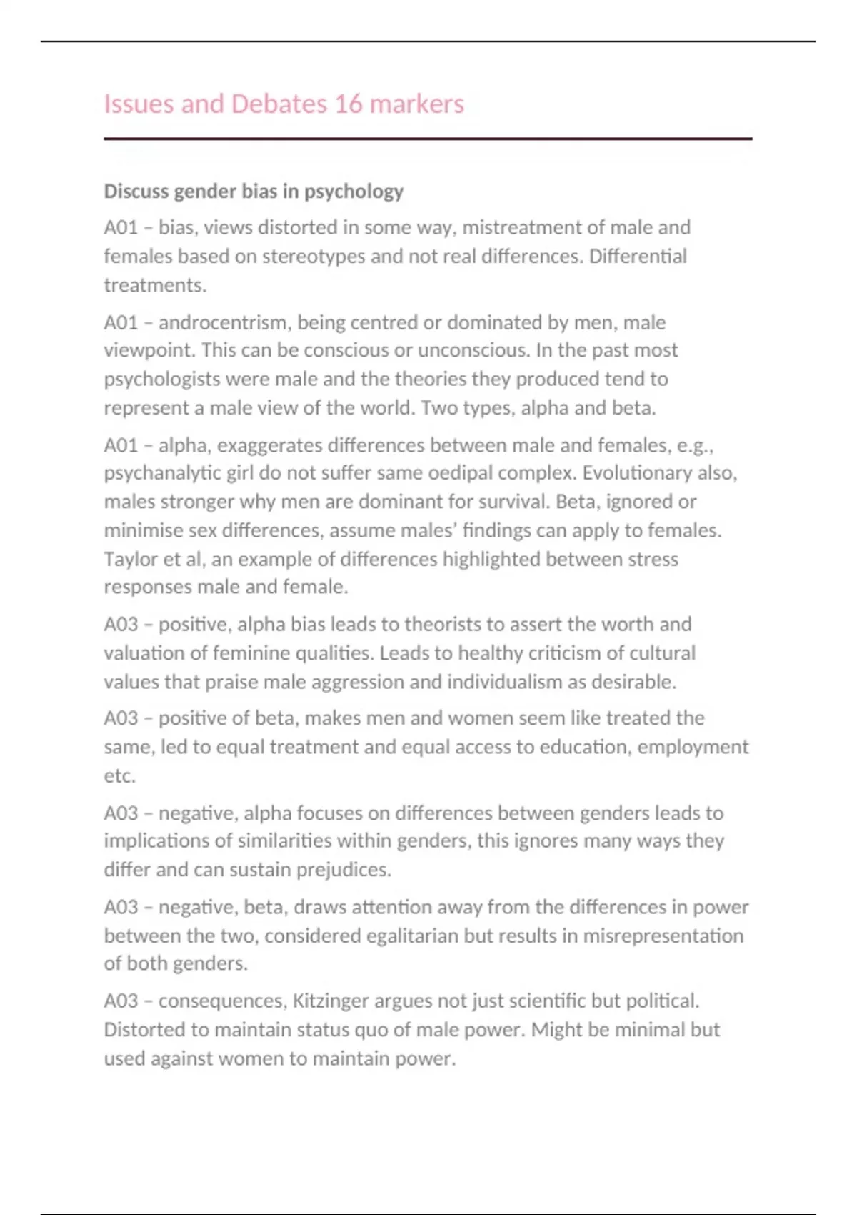 A03 – negative, alpha focuses on differences between genders leads to