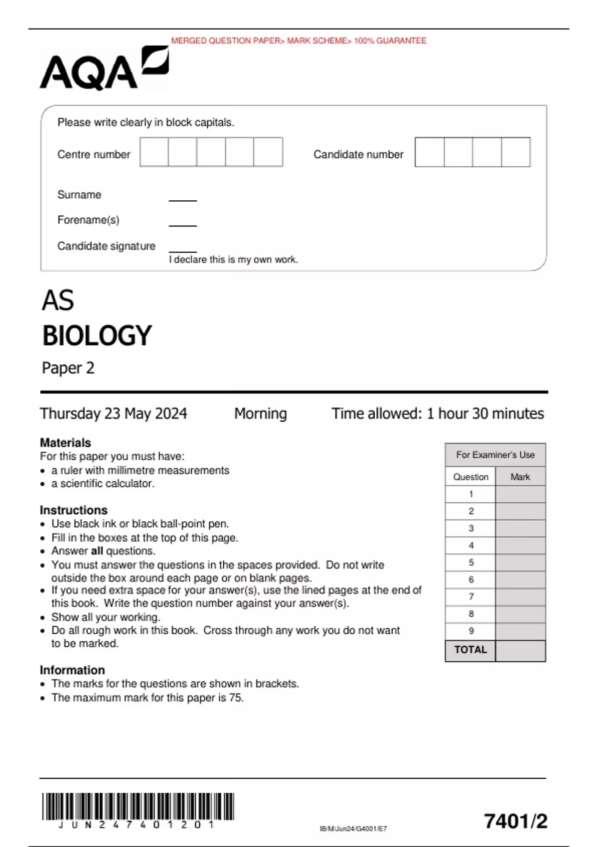 AS BIOLOGY Paper 2 Thursday 23 May 2024 Morning Time allowed: 1 hour 30 minutes Materials For this paper you must have:  a ruler with millimetre measurements  a scientific calculator. Instructions  Use black ink or black ball-point pen.  Fill in the boxes at the top of this page.  Answer all questions.  You must answer the questions in the spaces provided. Do not write outside the box around each page or on blank pages.  If you need extra space for your answer(s), use the lined pages at the end of this book. Write the question number against your answer(s).  Show all your working.  Do all rough work in this book. Cross through any work you do not want to be marked. Information  The marks for the questions are shown in brackets.  The maximum mark for this paper is 75.