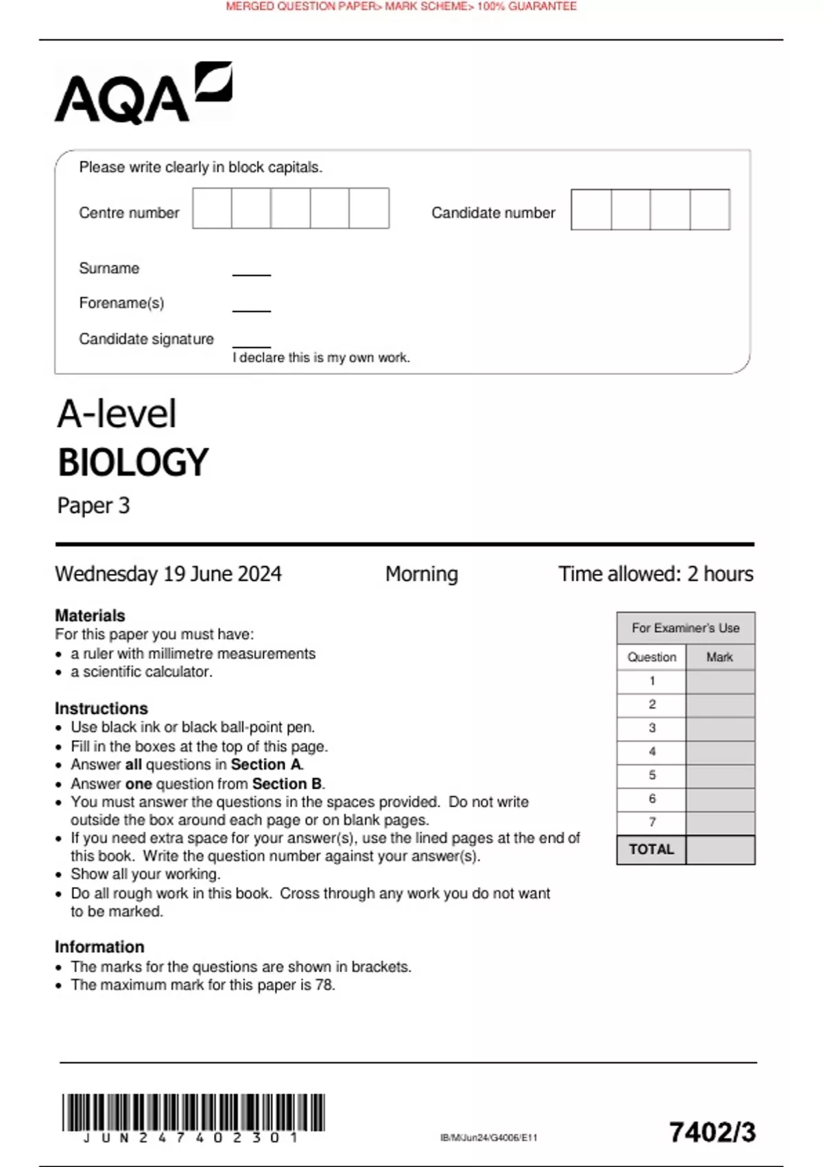 VERIFIED AQA JUNE 2024 A-level BIOLOGY Paper 3 MERGED QUESTION PAPER MARK SCHEME 100% GUARANTEE