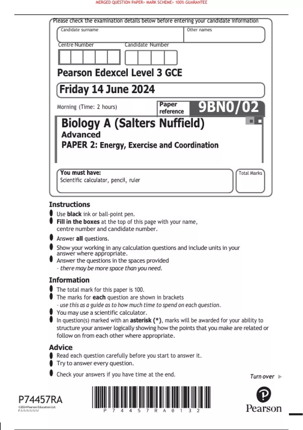 Pearson Edexcel Level 3 GCE Friday 14 June 2024 Morning (Time: 2 hours) Paper reference 9BN0/02 Biology A (Salters Nuffield) Total Marks Instructions Use black ink or ball-point pen. Fill in the boxes at the top of this page with your name, centre number and candidate number. • Show your working in any calculation questions and include units in your answer where appropriate. Answer the questions in the spaces provided – there may be more space than you need. Information The total mark for this paper is 100. The marks for each question are shown in brackets – use this as a guide as to how much time to spend on each question. You may use a scientific calculator. In question(s) marked with an asterisk (*), marks will be awarded for your ability to structure your answer logically showing how the points that you make are related or follow on from each other where appropriate. Advice Read each question carefully before you start to answer it. Try to answer every question. • Check your answers if you have time at the end.