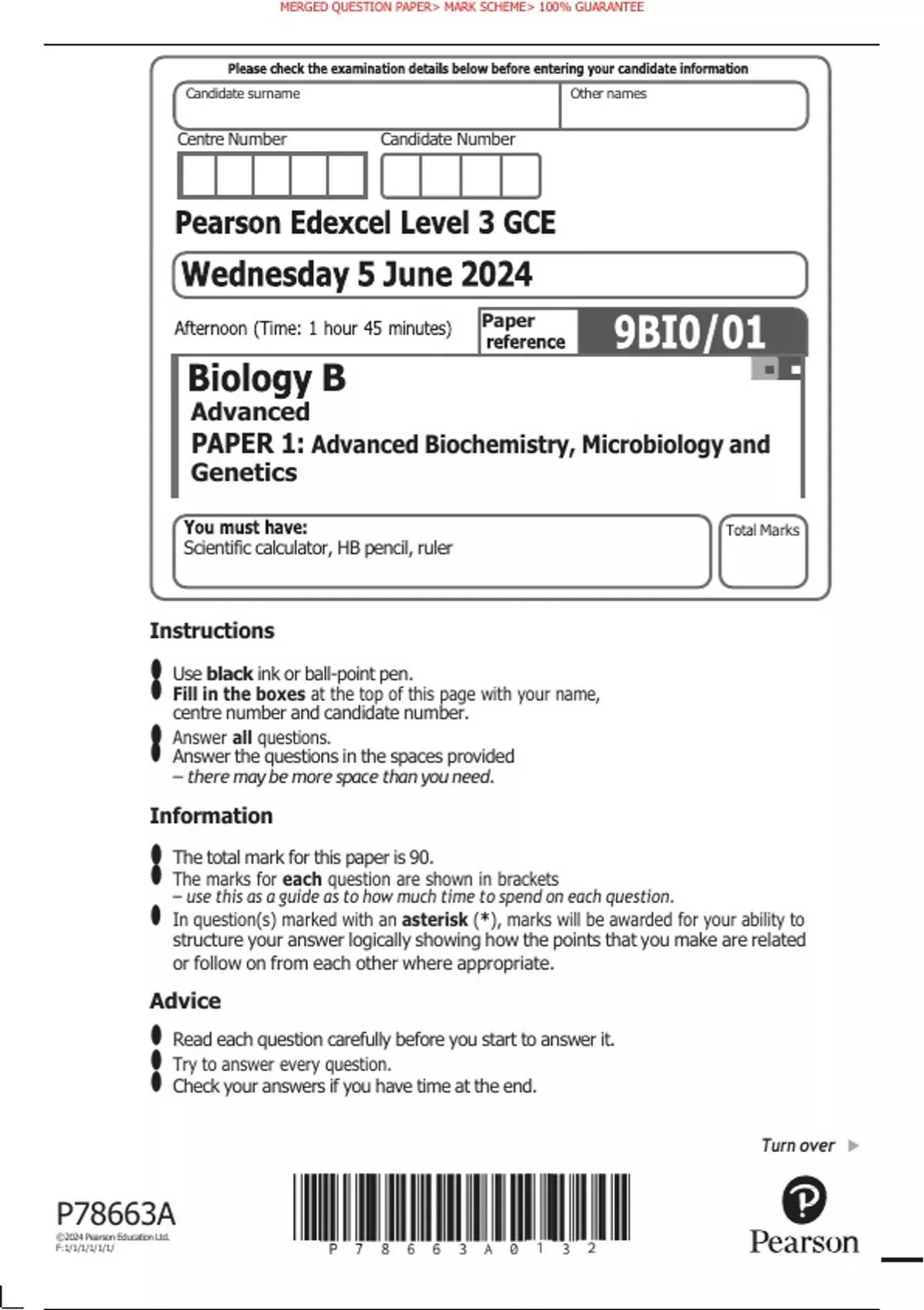Biology B Advanced PAPER 1: Advanced Biochemistry, Microbiology and GeneticsInstructions • Use black ink or ball‑point pen. centre number and candidate number. Answer the questions in the spaces provided – there may be more space than you need. Information • The total mark for this paper is 90. – use this as a guide as to how much time to spend on each question. In question(s) marked with an asterisk (*), marks will be awarded for your ability to structure your answer logically showing how the points that you make are related or follow on from each other where appropriate. Advice • Read each question carefully before you start to answer it. • Check your answers if you have time at the end.