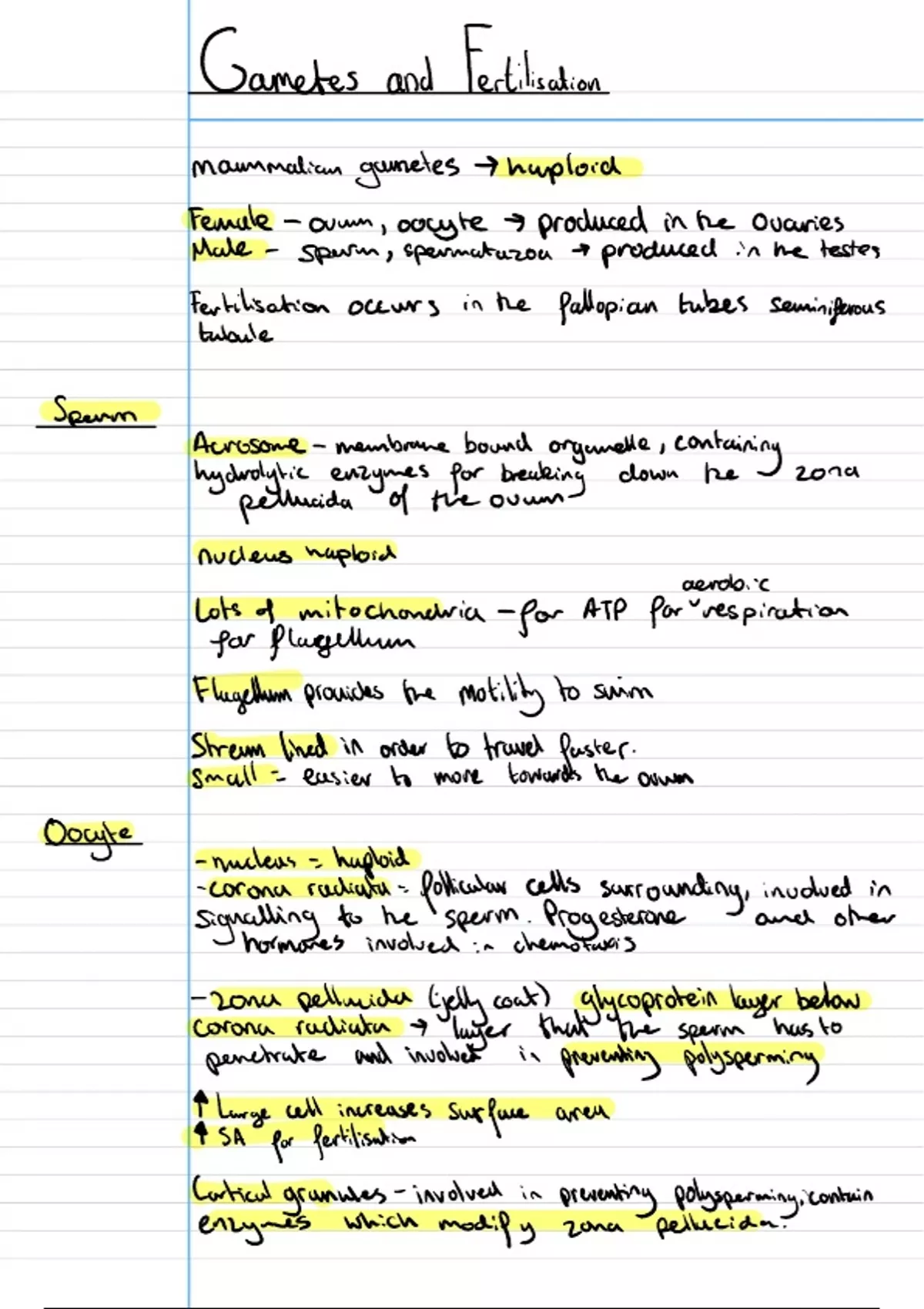 Summary Topic 3 Gametes and Fertilisation