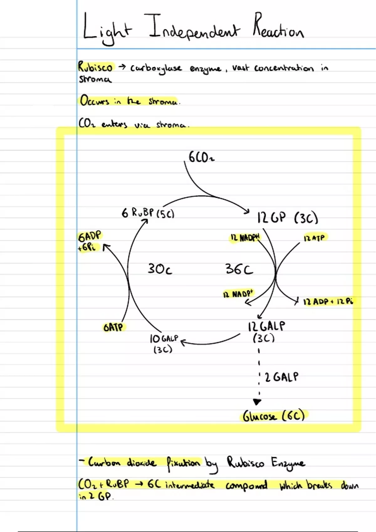 Edexcel Biology Topic 5 Light Independent Reaction, Calvin Cycle, Glucose, ATP, NADPH+