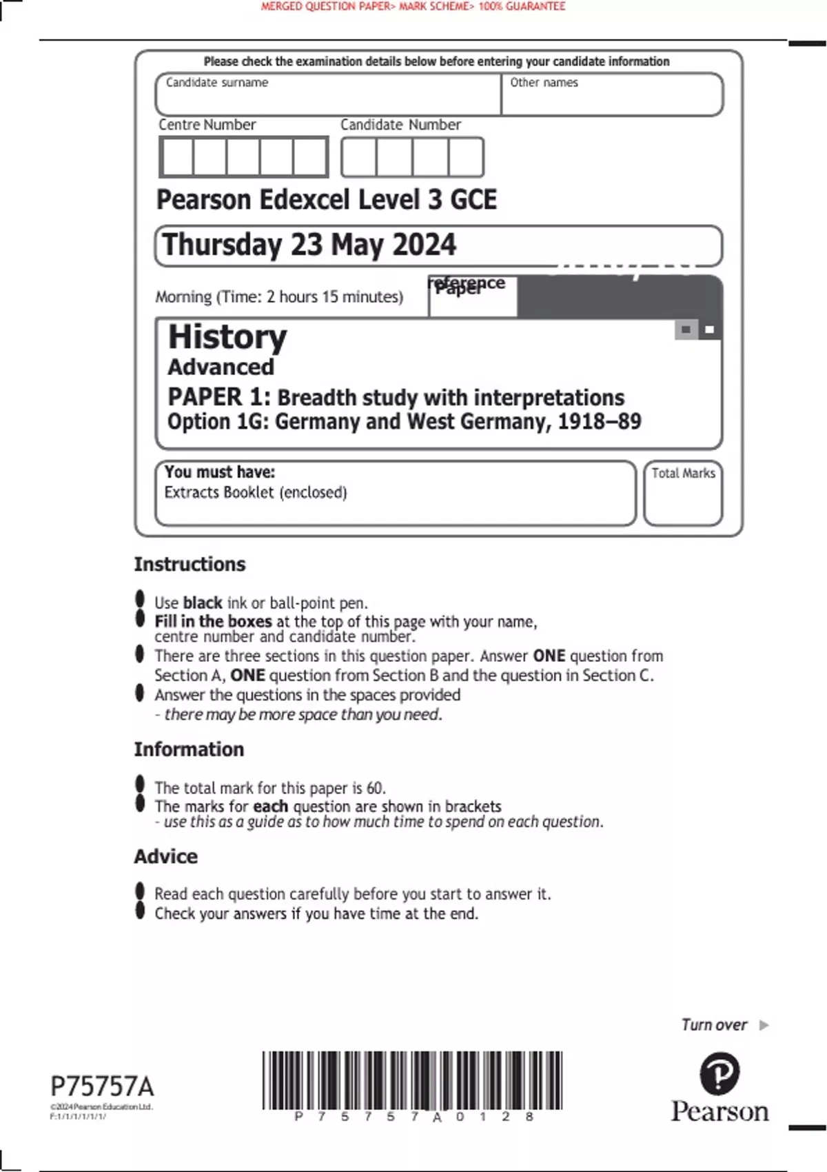 Pearson Edexcel Level 3 GCE Thursday 23 May 2024 reference 9HI0/1G Morning (Time: 2 hours 15 minutes) History Advanced Paper PAPER 1: Breadth study with interpretations Option 1G: Germany and West Germany, 1918–89 Instructions • Use black ink or ball-point pen. centre number and candidate number. There are three sections in this question paper. Answer ONE question from Section A, ONE question from Section B and the question in Section C. Answer the questions in the spaces provided – there may be more space than you need. Information • The total mark for this paper is 60. – use this as a guide as to how much time to spend on each question. Advice • Read each question carefully before you start to answer it.