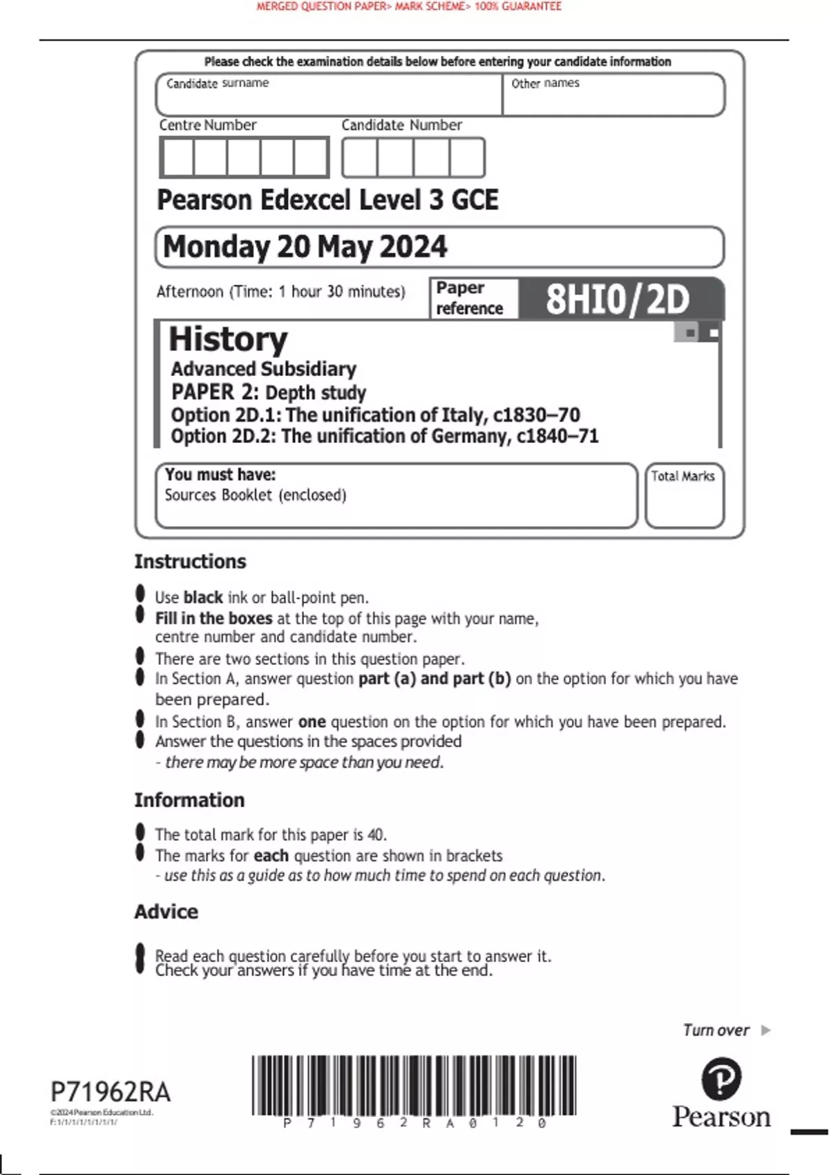 VERIFIED GCSE MAY 2024 Pearson Edexcel Level 3 GCE History Paper Advanced Subsidiary PAPER 2: Depth study Option 2D.1: The unification of Italy, c1830–70 Option 2D.2: The unification of Germany, c1840–7 MERGED QUESTION PAPER MARK SCHEME 100% GUAR