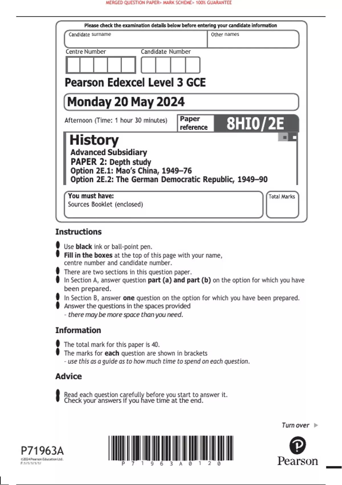 VERIFIED GCSE MAY 2024 Pearson Edexcel Level 3 GCE History Advanced Subsidiary PAPER 2: Depth study Option 2E.1: Mao’s China, 1949–76 Option 2E.2: The German Democratic Republic, 1949–9 MERGED QUESTION PAPER MARK SCHEME 100% GUARANTEE