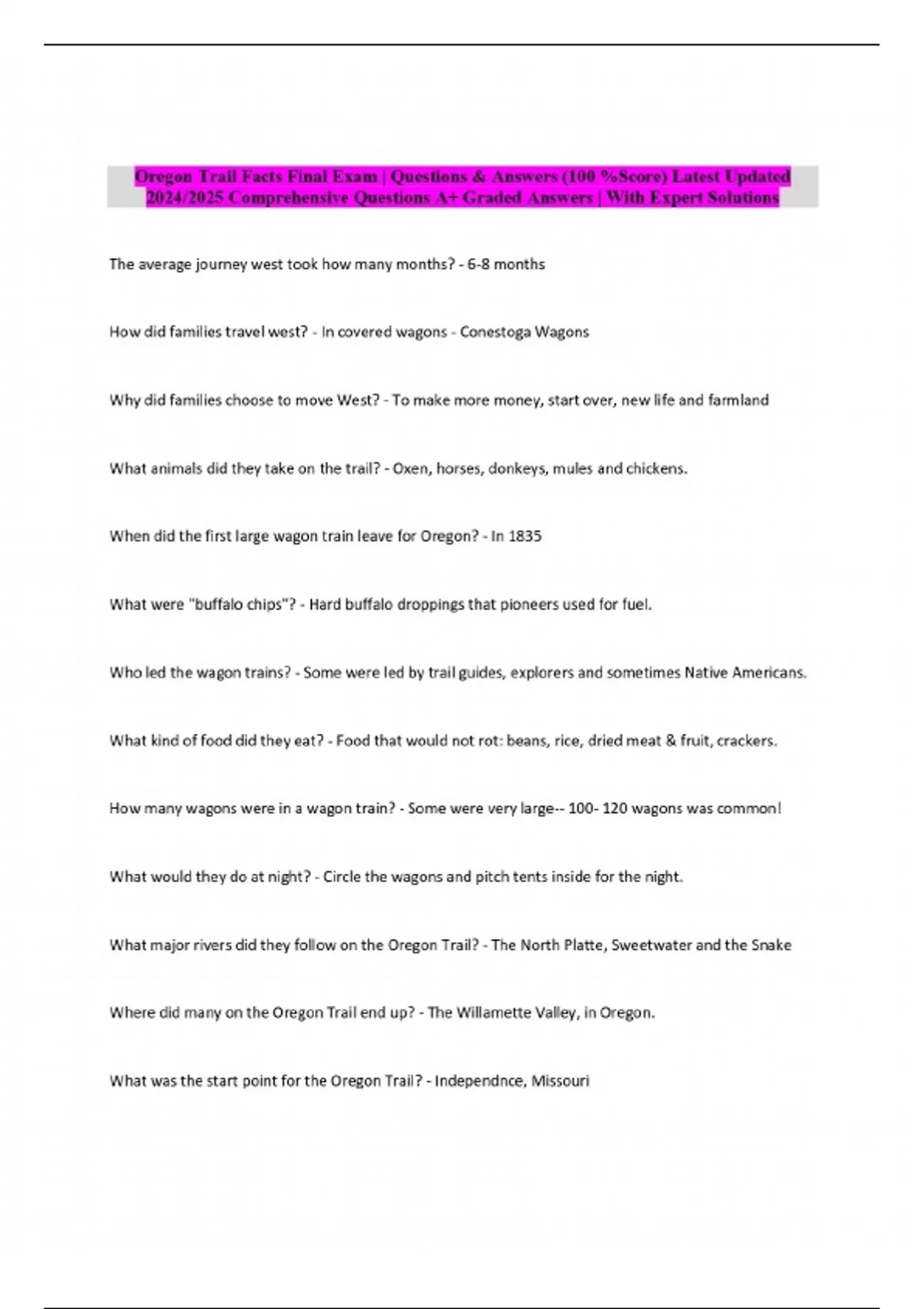 Oregon Trail Facts Final Exam | Questions & Answers