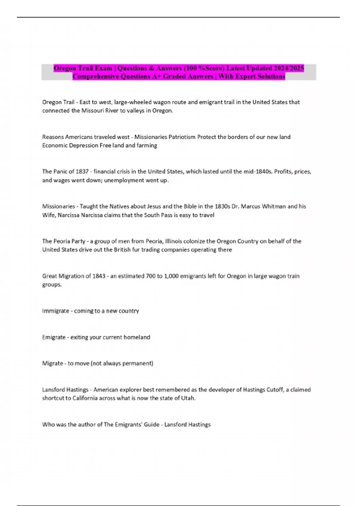 Oregon Trail Exam | Questions & Answers
