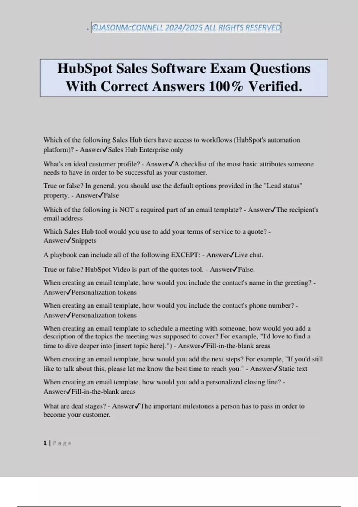 HubSpot Sales Software Exam Questions With Correct Answers 100% Verified. Which of the following Sales Hub tiers have access to workflows (HubSpot's automation platform)? - AnswerSales Hub Enterprise only What's an ideal customer profile? - AnswerA checklist of the most basic attributes someone needs to have in order to be successful as your customer. True or false? In general, you should use the default options provided in the "Lead status" property. - AnswerFalse Which of the following is NOT a required part of an email template? - AnswerThe recipient's email address Which Sales Hub tool would you use to add your terms of service to a quote? - AnswerSnippets A playbook can include all of the following EXCEPT: - AnswerLive chat. True or false? HubSpot Video is part of the quotes tool. - AnswerFalse. When creating an email template, how would you include the contact's name in the greeting? - AnswerPersonalization tokens When creating an email template, how would you include the contact's phone number? - AnswerPersonalization tokens When creating an email template to schedule a meeting with someone, how would you add a description of the topics the meeting was supposed to cover? For example, "I'd love to find a time to dive deeper into [insert topic here].") - AnswerFill-in-the-blank areas When creating an email template, how would you add the next steps? For example, "If you'd still like to talk about this, please let me know the best time to reach you." - AnswerStatic text When creating an email template, how would you add a personalized closing line? - AnswerFill-in-the-blank areas What are deal stages? - AnswerThe important milestones a person has to pass in order to become your customer