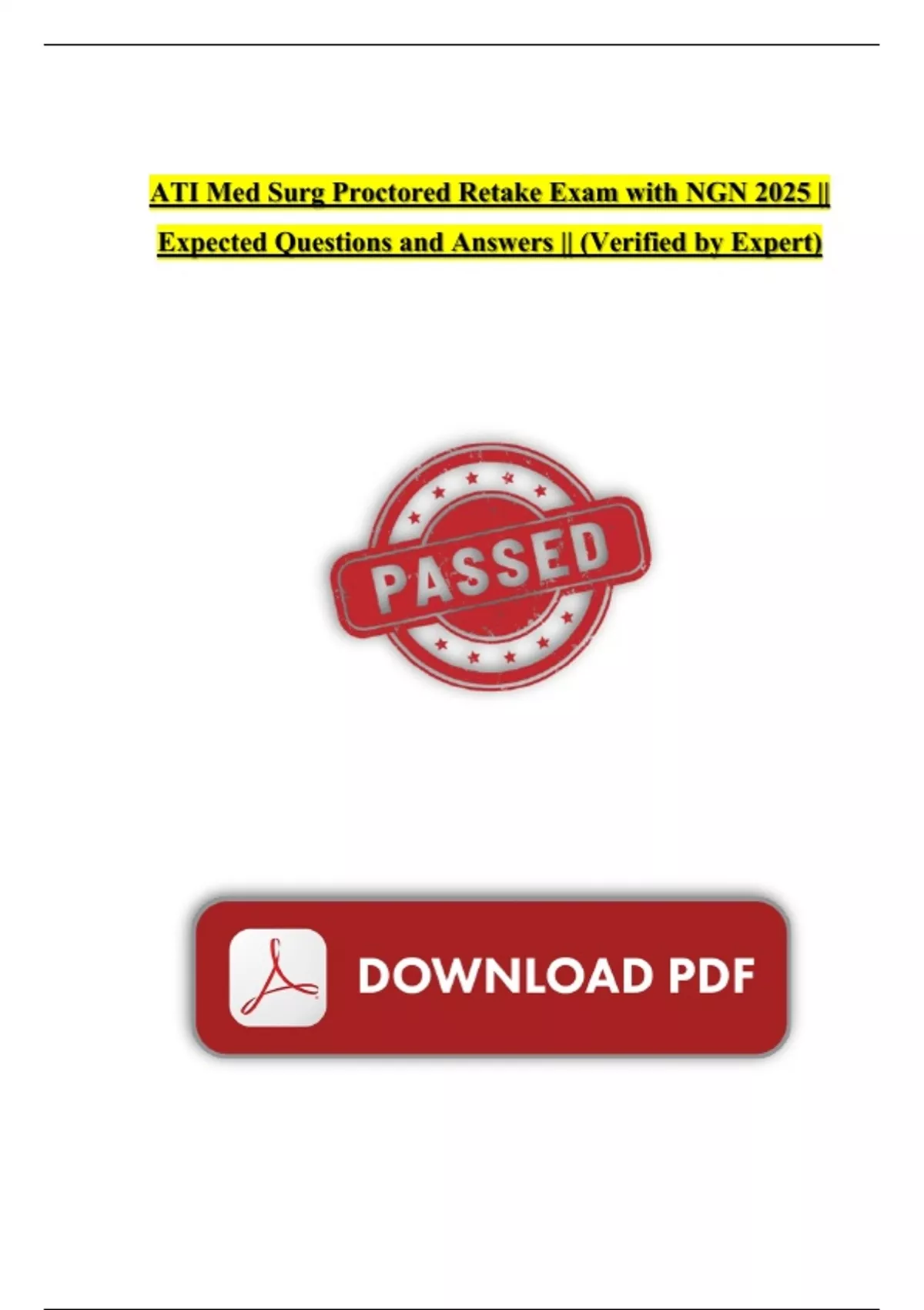 This document provides expert-verified expected questions and correct answers for the 2025 ATI Medical-Surgical Proctored Retake Exam, formatted in line with the latest NGN (Next Generation NCLEX) standards. It covers high-yield topics such as cardiovascular, respiratory, renal, endocrine, and neurological disorders, medication administration, and priority setting. Ideal for students preparing for their ATI Med-Surg retake with focused and accurate content.