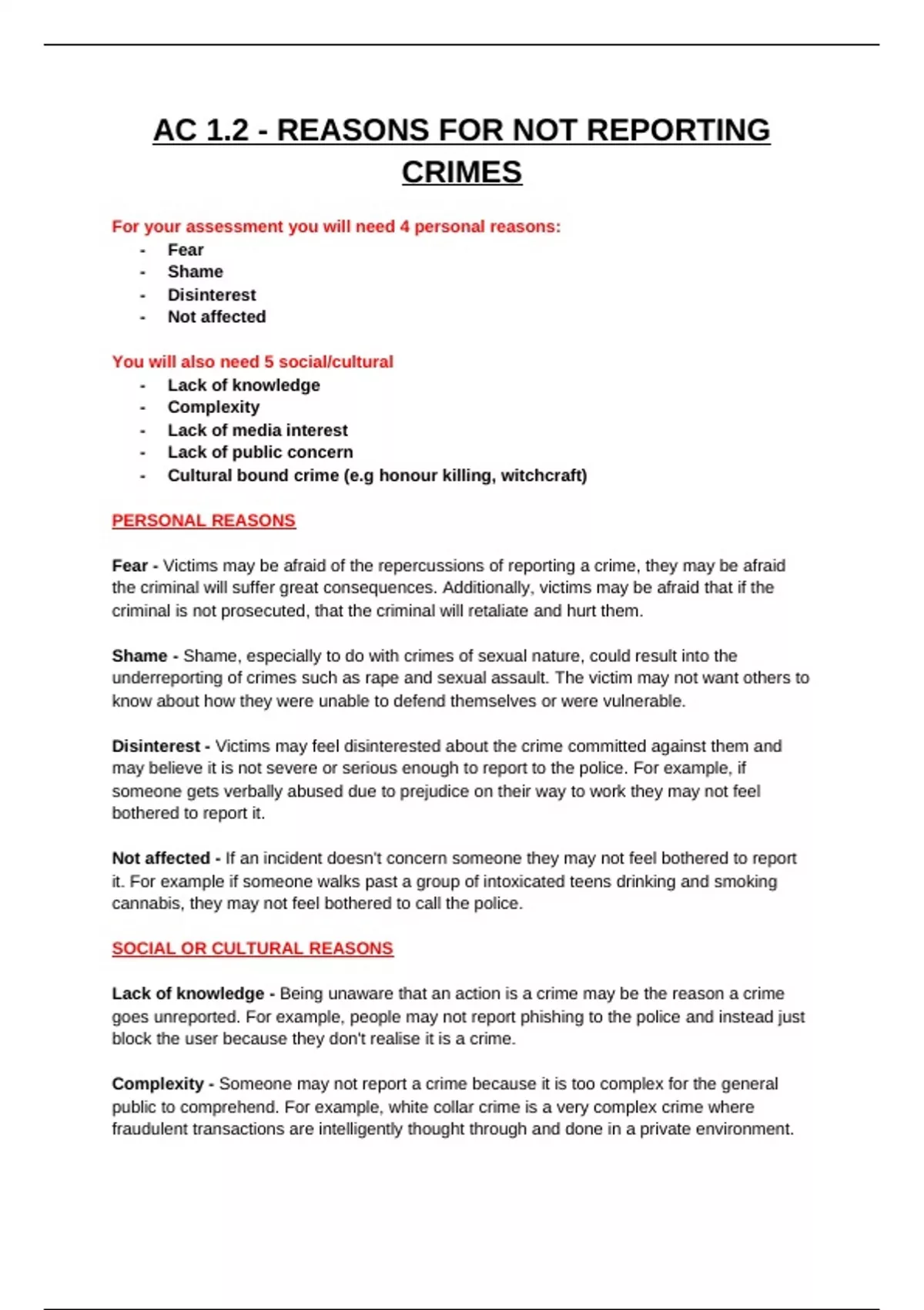 Summary Unit 1 Criminology AC 1.2 Reasons for not reporting crime