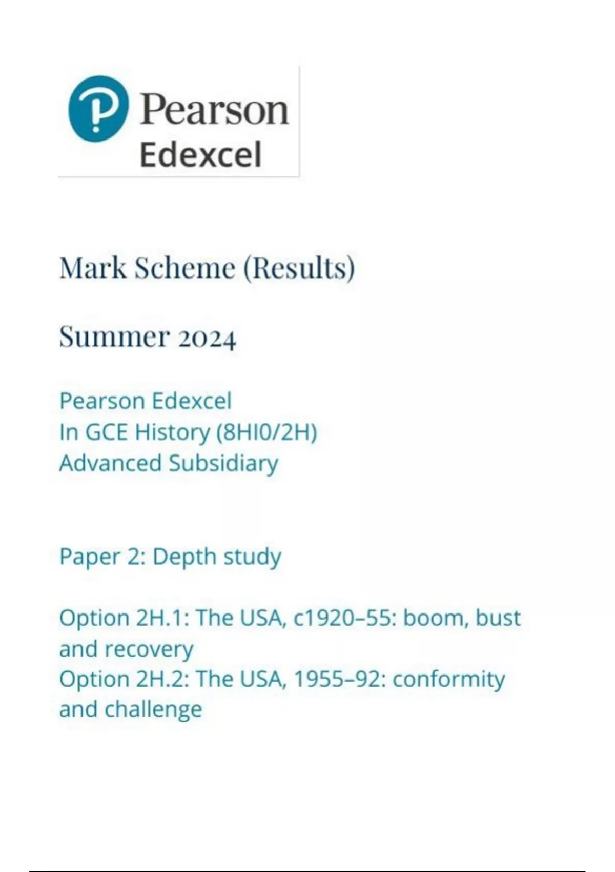 Pearson Edexcel In GCE History (8HI0/2H) Advanced Subsidiary Paper 2: Depth study Option 2H.1: The USA, c1920–55: boom, bust and recovery Option 2H.2: The USA, 1955–92: conformity and challenge mark scheme june 2024