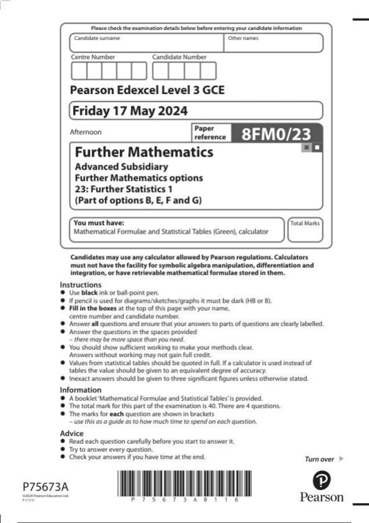 Pearson Edexcel Level 3 GCE 8fm0-23 Further Mathematics Advanced Subsidiary Further Mathematics options 23: Further Statistics 1 (Part of options B, E, F and G) question paper june 2024